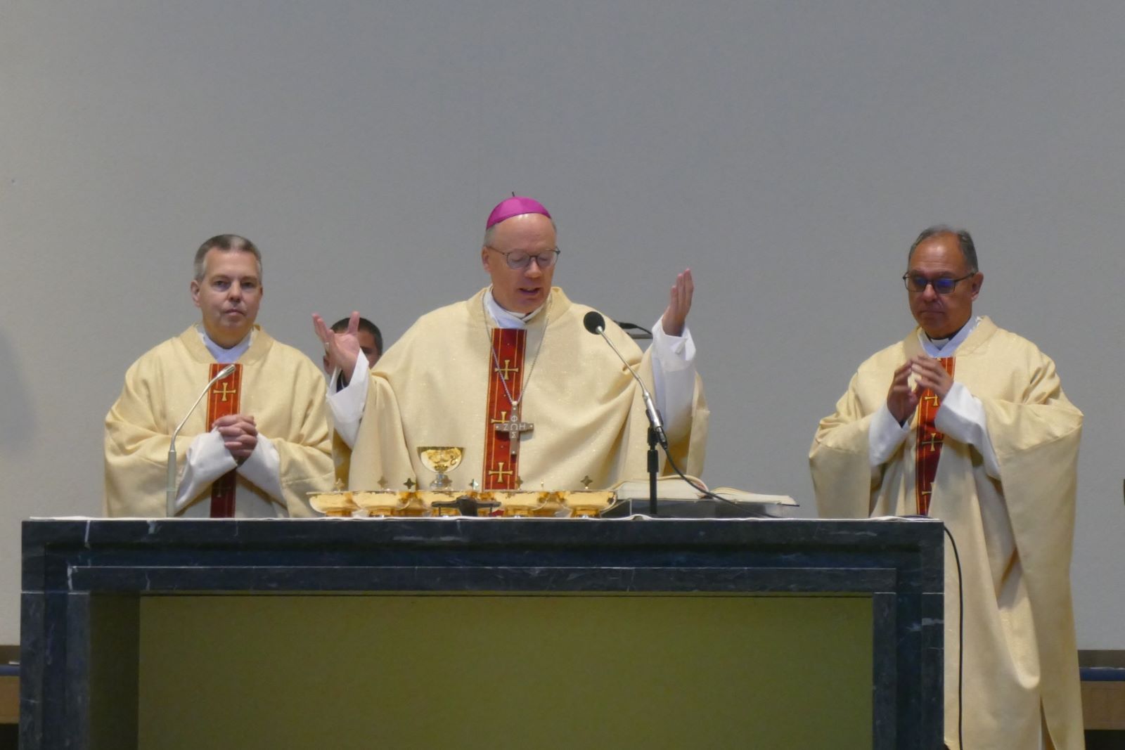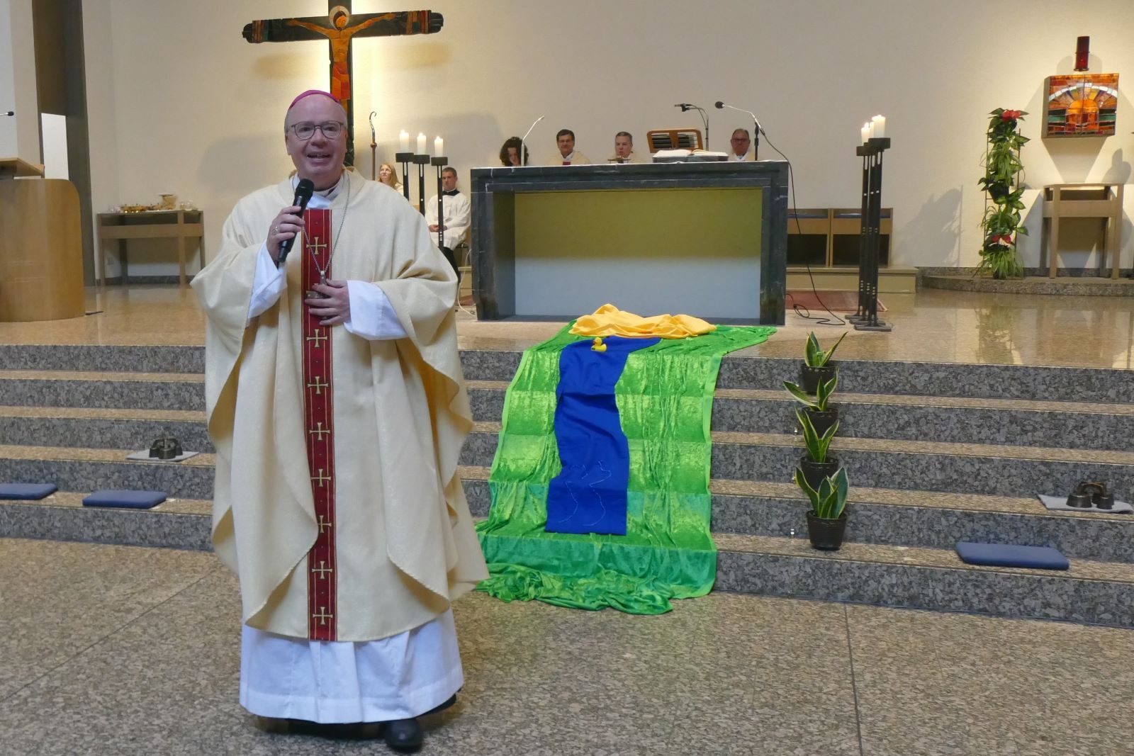 Bischof Stefan Ackermann (Trier) bezog sich in seiner Predigt auf die vorgelesene Geschichte, in der ein Weiser gefragt wird, warum er so ruhig und langanhaltend aufs Wasser schaut und dann erklärt, dass Wasser mutig, ausdauernd, freigebig, Unebenheiten ausgleichend, Felsen umfließend sei und lehre, wie Menschen leben sollten. In diesem Zusammenhang erschloss der Bischof das vorgetragene Evangelium, ein Gespräch Jesu mit der Samariterin am Jakobsbrunnen. Aus der Zusammenschau beider Texte richtete er drei Appelle an die Schülerinnen: „Seid bereit auch gegen den Strom zu schwimmen, wenn ihr es innerlich spürt!“ „Gebt euch nicht mit der Oberfläche zufrieden, schaut tiefer!“ „Haltet Ausschau nach vertrauensvollen Beziehungen, führt Gespräche am Brunnenrand und bezieht Jesus mit ein!“ Beide Erzählungen seien Bilder, die ein Leben lang begleiten und helfen könnten, den Sinn des Lebens und die Verankerung zu entdecken, die nur Jesus geben könne, der die Quelle sei, so der Bischof.