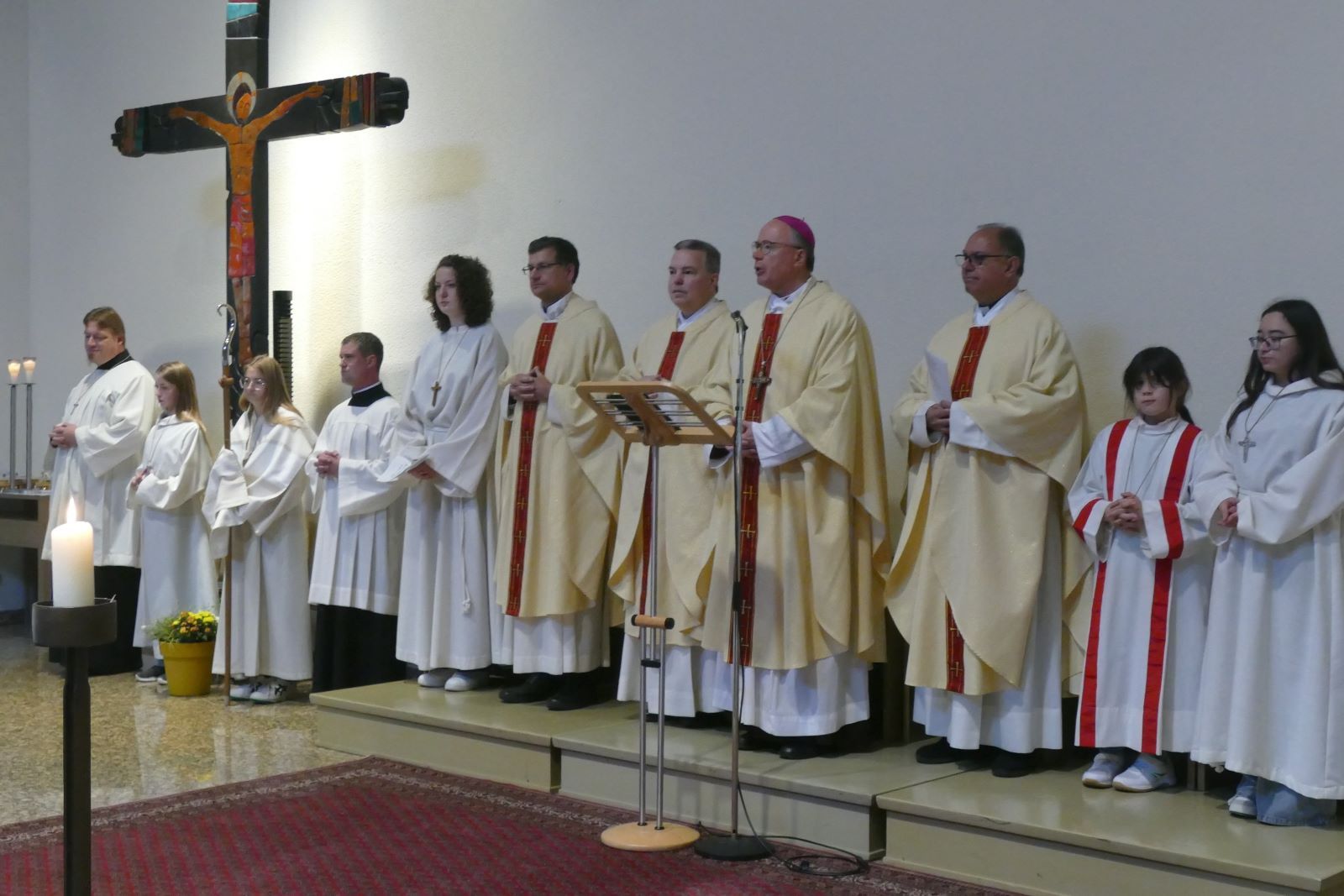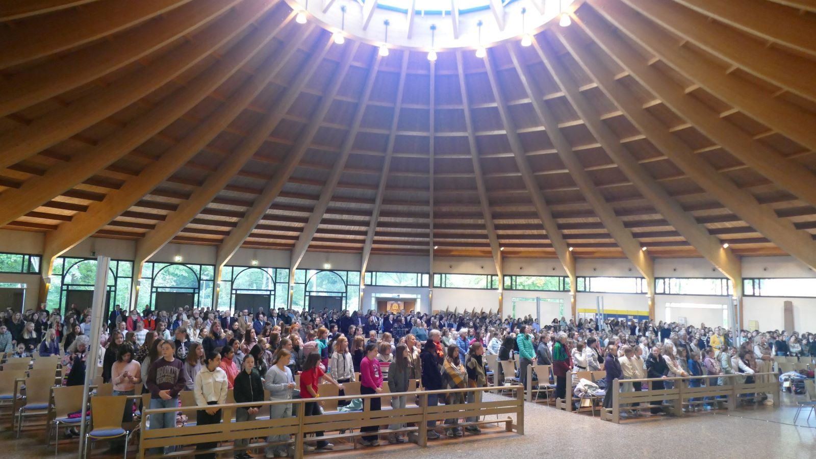 Stimmungsvolle Lieder von und mit dem Schulchor, lebensnahe Fürbitten, untermalende Bilder zu den jeweiligen Texten per Beamer eingespielt und mitgehende, engagierte Jugendliche machten den Gottesdienst zu etwas Besonderem. Die Vereinigung „Lehrer ohne Grenzen“ meldete sich am Ende der Heiligen Messe per Video zu Wort und „überreichte“ einen Scheck über 5.000 Euro als Geburtstagsgeschenk für das Projekt ETG Partnerschule Burundi, für das sich die Marienschülerinnen schon seit Jahren einsetzen. Als der Bischof am Ende des Gottesdienstes Frau Katharina Lukas, die einzige anwesende Schülerin der ersten Tage der Marienschule im Jahr 1945 auf die Altarstufen bat, brandete lebhafter Applaus auf und nachdem sie kurz erzählt hatte, wie es dazu kam, dass sie Schülerin der Marienschule wurde und wie sehr sie diese Schule geliebt habe, gab es sogar standing ovations.
