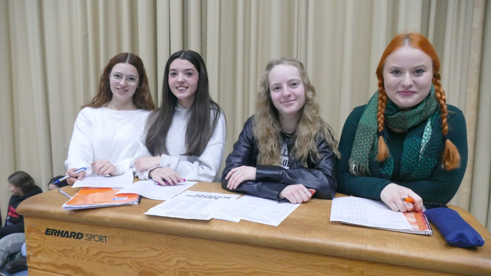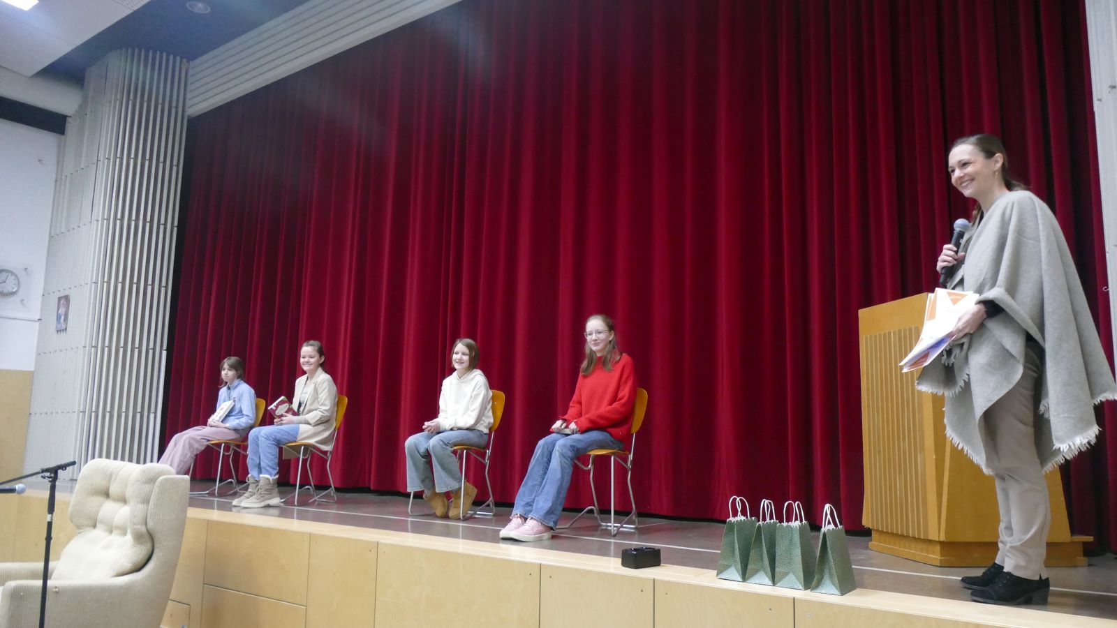 Die erste Schulstunde kerngesund in eine kuschlig warme Decke gehüllt und auf einem Kopfkissen gebettet zu genießen – das ist vielleicht der Traum so mancher Schülerin. Wer wollte, konnte ihn am 05.12.2025 wahrmachen und im Liegen die letzte Runde des Vorlesewettbewerbs auf Schulebene verfolgen. Die meisten Schülerinnen saßen jedoch, weil sie so besser mitfiebern konnten mit ihrer Klassenkameradin, die im Schulentscheid um die Wette lesen würde. Frau Blatt begrüßte das große Auditorium. Frau Luß gratulierte den Klassensiegerinnen - aus der 6a: Pina Sch., der 6b: Amelie Claire L., der 6c: Clara Christ und der 6d: Paulina B. und überreichte ihnen eine Urkunde sowie eine Präsenttasche.