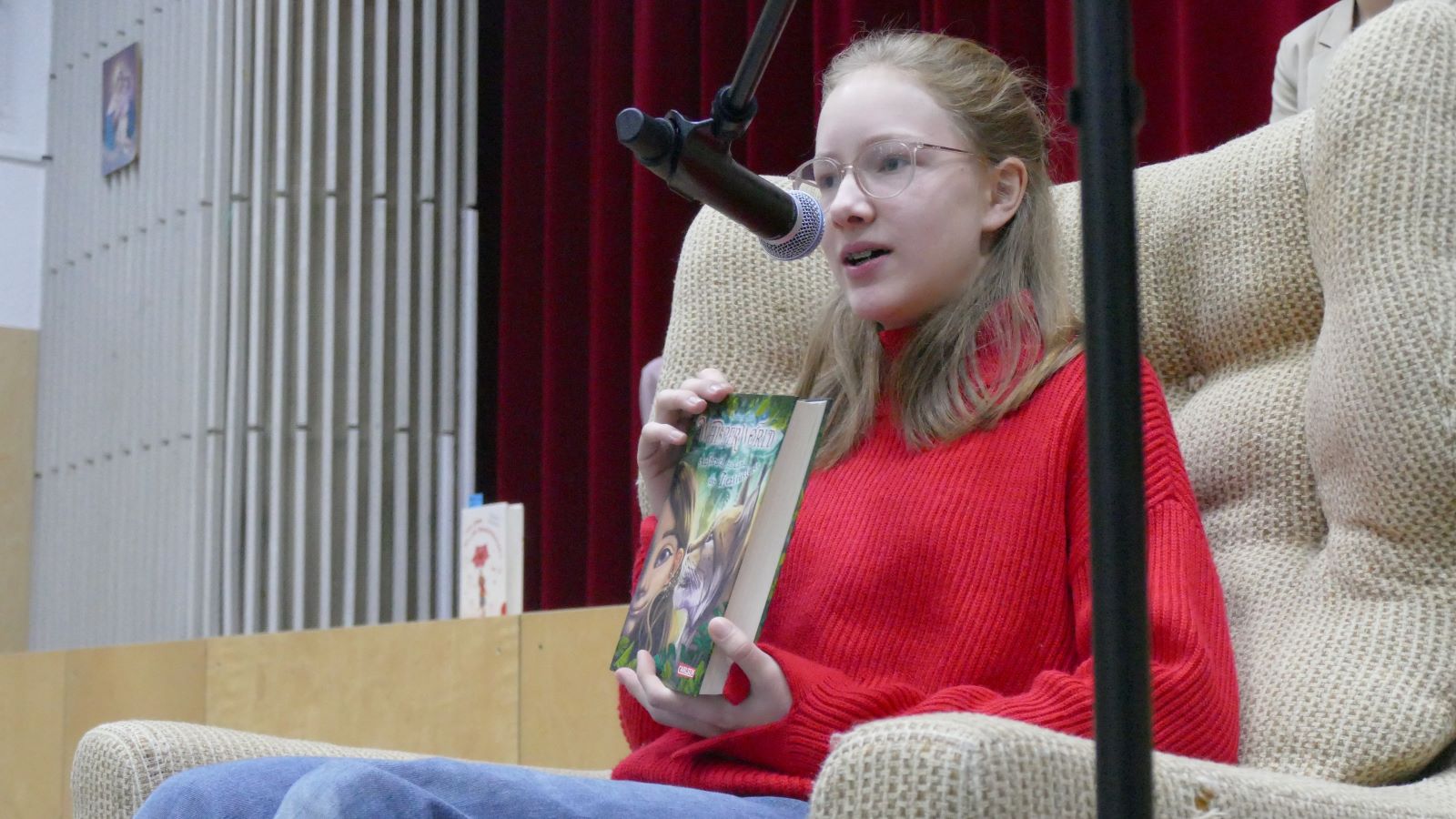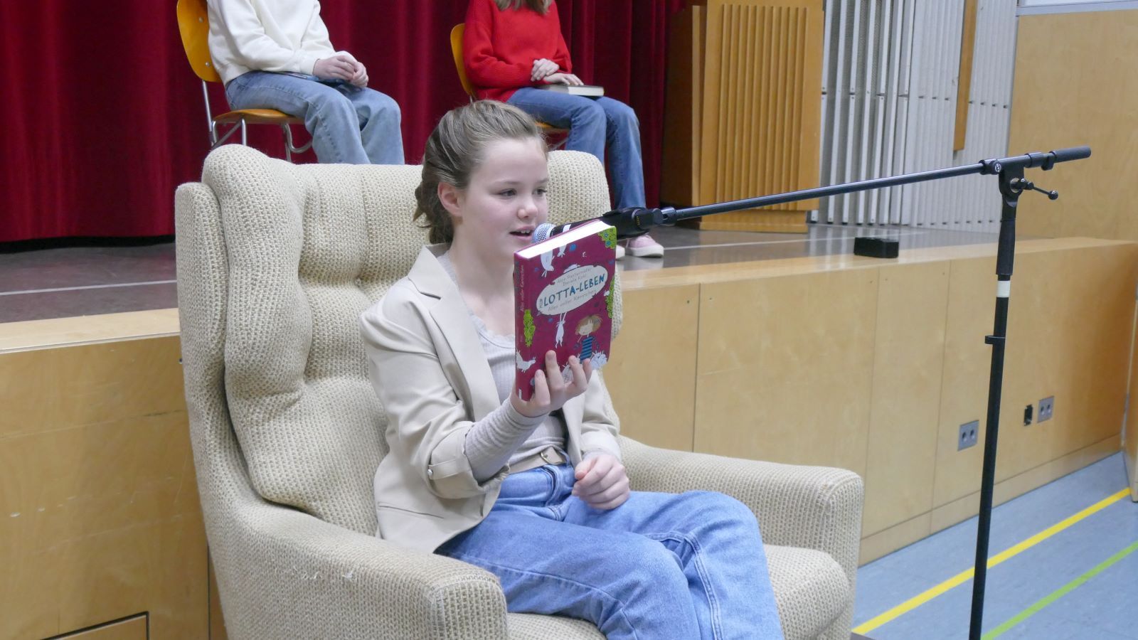 Dann wurde es so richtig spannend. Nacheinander wechselten die Klassensiegerinnen auf den großen Vorlesesessel, der – leicht erhöht – vorne in der Aula stand und lasen aus dem Roman ihrer Wahl eine ausgewählte Textstelle vor. Die acht Klassen der Unterstufe hatten an jenem Freitagmorgen ein spannendes und heiteres Lektüreerlebnis, denn die Schülerinnen lasen wirklich gut.