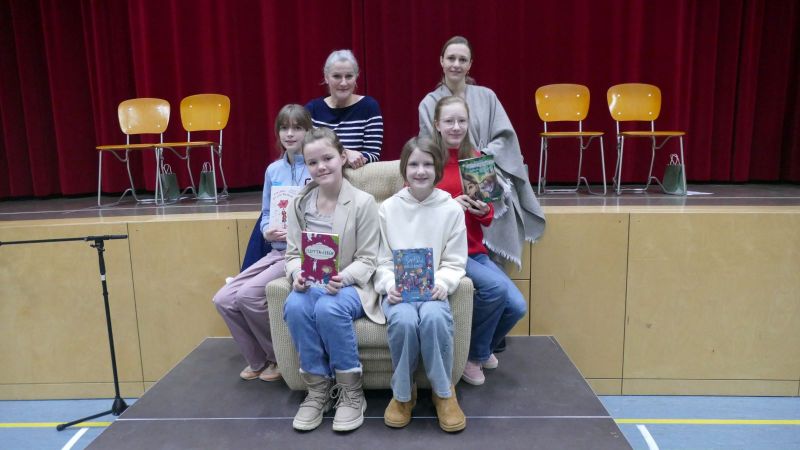 Anschließend bestand die Herausforderung der Wettbewerbsteilnehmerinnen darin, einen ihnen unbekannten Text vorzulesen. Jede gab ihr Bestes und unterhielt mit einer humorvollen Erzählung die Zuhörerinnen aufs Beste. Die Jury, bestehend aus Lehrkräften und Vertreterinnen der SV, bewerteten die Leseleistungen und ermittelte am Ende die Schulsiegerinnen: Pina aus der 6a und Paulina aus der 6d. Herzliche Glückwunsche und gutes Weiterkommen auf der nächsten Ebene des Vorlesewettbewerbs.