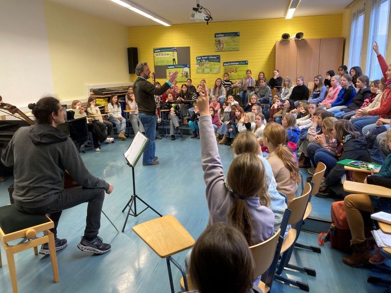 In drei Stunden saßen jeweils drei Klassen dicht gedrängt im Musikraum und folgten der Reise durch die Musikwelt der Superlative, die je nach Fragen und Antworten der lebhaft beteiligten Zuhörerinnen in jeder Stunde etwas anders ausfiel.