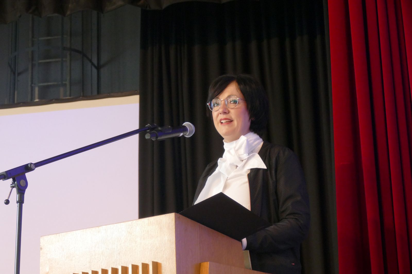 Auch die MSS-Leiterin Frau Speier griff das Bild vom Diamanten auf und zog Parallelen zum Werdegang und Schulalltag der Abiturientinnen, die nun in die Welt hinausgingen, mit einer Ausbildung oder einem Studium beginnen würden. Sie überreichte ihnen ein Geschenk als Zeichen, dafür, dass sie außerhalb der Schule weiterwachsen dürften, wertvoll seien und die Welt mit ihrem Funkeln erhellen mögen.