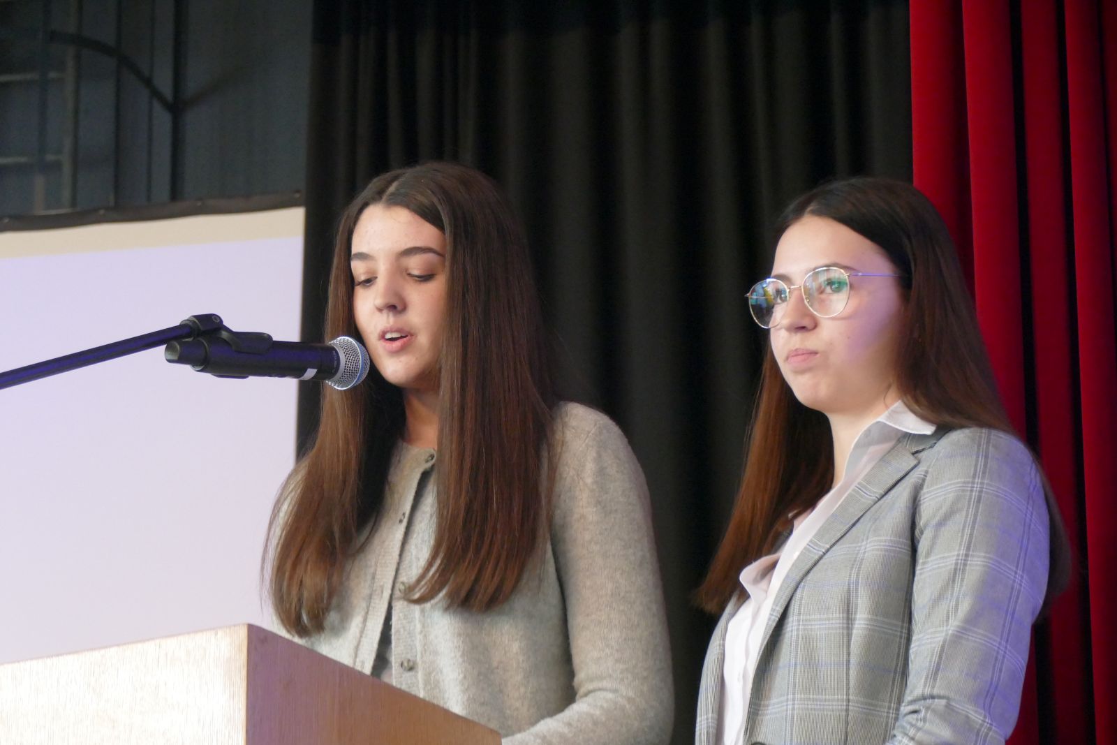 Aurelia L. und Marie St. standen für den Abiturjahrgang am Mikrophon. Sie hielten Rückschau auf die Jahre, die sie gemeinsam verbracht hatten – mit Höhen und Tiefen, Auf und Ab. Sie seien stolz auf ihre Entwicklung, auch wenn es nicht immer leicht gewesen sei, und dankten ihren Mitschülerinnen und guten Freunden, den Eltern für ihre Unterstützung und den Lehrkräften für ihre Geduld. Besonders hoben sie das unermüdliche Engagement ihrer Stammkurslehrerinnen Frau Bürger und Sr. Christamaria und das der Oberstufenleiterin Frau Speier hervor. Sie hätten ihnen mit Rat und Tat zur Seite gestanden und sie in der Oberstufenzeit stets begleitet. Mit Hoffnung und Zuversicht würden sie jetzt in die Zukunft schauen.
