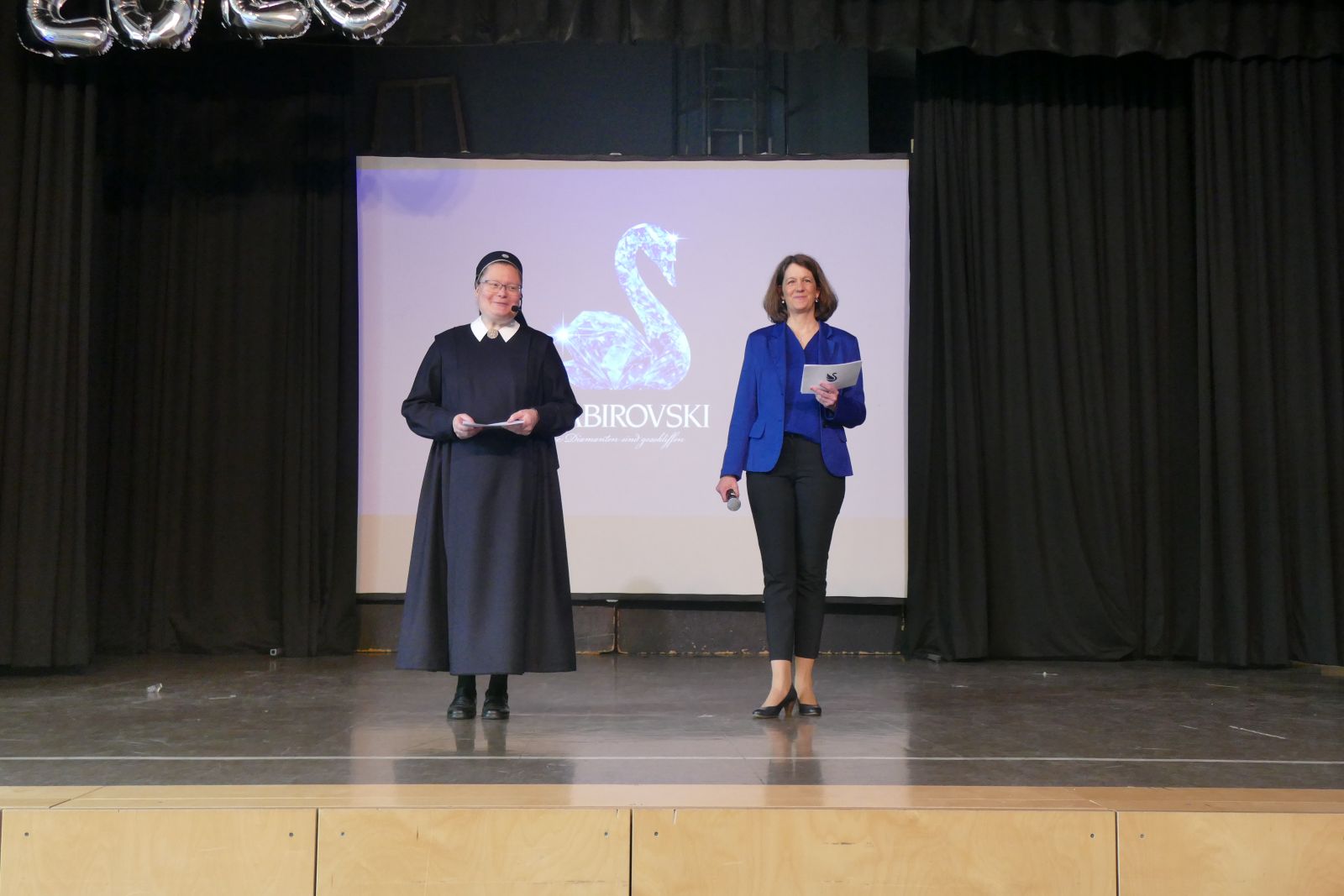 Nach dem Abiturgottesdienst wurde die Feier am 27.03.2026 in der Aula der Marienschule fortgesetzt. Zur Einstimmung präsentierten die Stammkurslehrerinnen Frau Bürger und Sr. Christamaria eine eigens zum Abimotto „Swabirovski – Die Diamanten sind geschliffen“ generierte effektvolle Filmouvertüre. Daraufhin zogen die Abiturientinnen glamourös in die Aula ein und nahmen auf der Bühne Aufstellung. Dort trugen sie ihr sogenanntes „5er-Lied“ vor, mit dem sie sich vor fast neun Jahren der Schulgemeinschaft vorstellten.