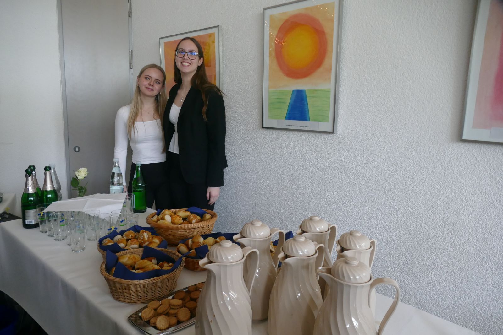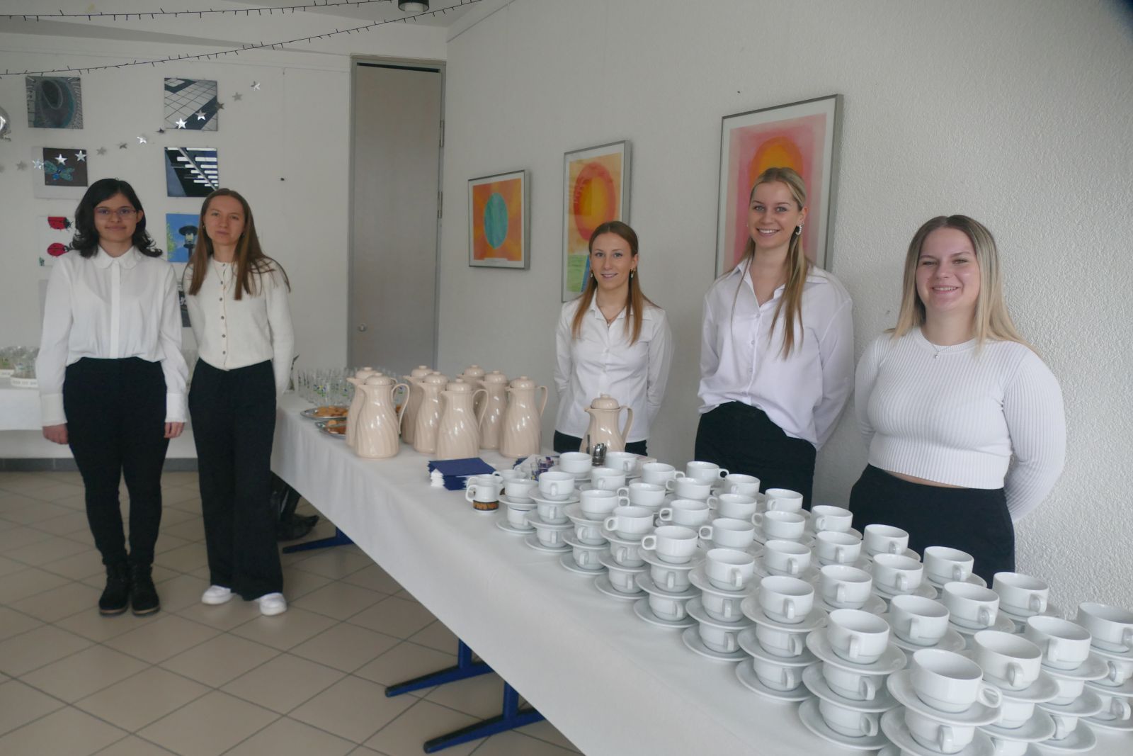 Während der Feierlichkeiten hatten sich die Schülerinnen der MSS 12 zusammen mit ihren Stammkurslehrerinnen um das leibliche Wohl der Festgesellschaft gekümmert. Für den Sektempfang im Wintergarten war alles bereitet. Weiße Rosen und Diamanten zierten die Tische.