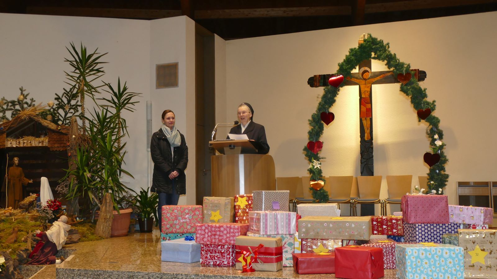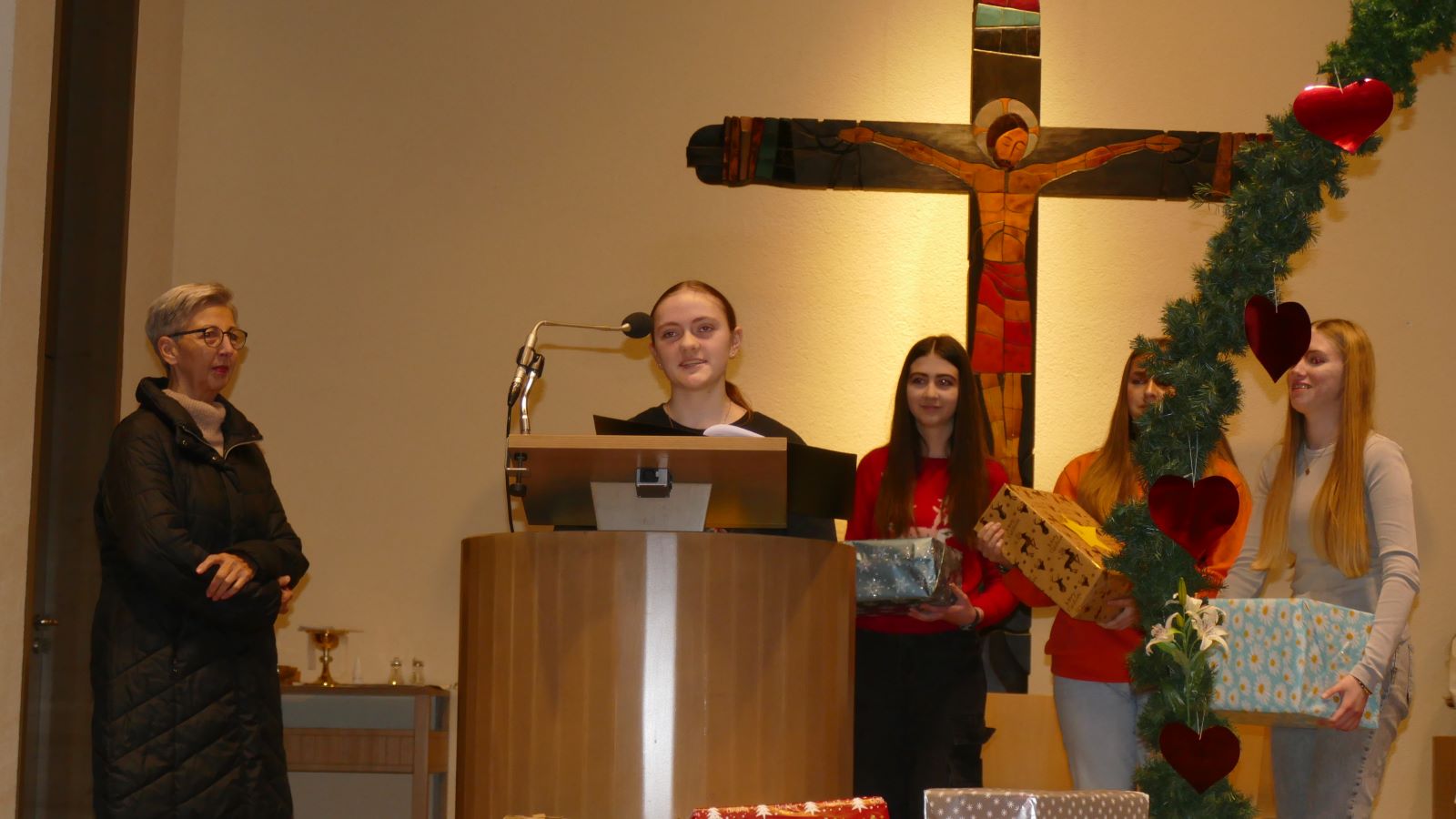 Am Ende des Gottesdienstes überreichte die SV Frau Eichenberg von Lichtzeichen e.V. mehr als 40 Pakete mit Lebensmittel, die die Klassen für schwangere Frauen gepackt hatten. Frau Eichenberg wies darauf hin, dass die Entstehung eines kleinen Menschen ein Wunder ist, das sich kein Mensch ausdenkt und auch alle Schülerinnen ein Wunder sind, das sich kein Mensch ausdenkt.