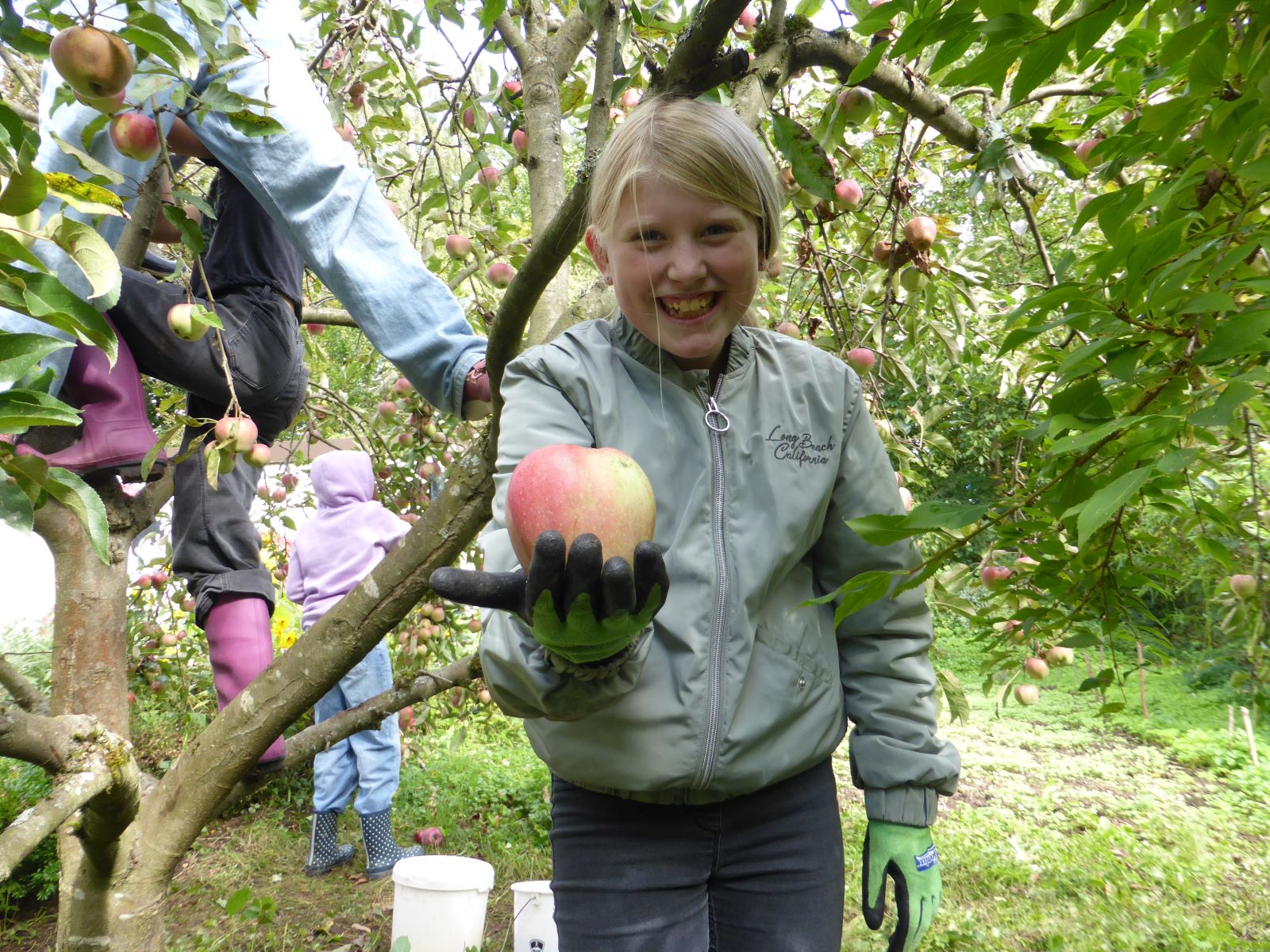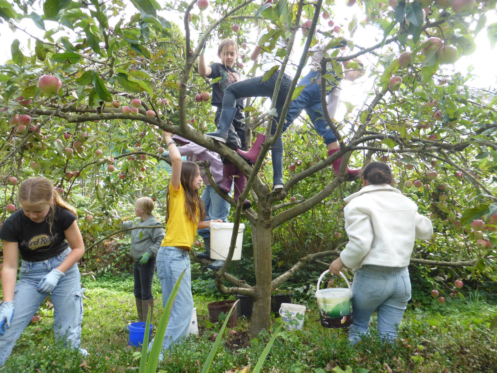 Doch der Herbst hat noch mehr Überraschungen bereit. Vom Apfelbaum her grüßten die dicken roten Äpfel die Schülerinnen. Der Baum konnte in diesem Jahr die Last der vollen Äste kaum noch tragen. Erstaunlich: Am stärksten lockten die Äpfel auf den hohen Zweigen des Baumes! Zum Glück hielt der Baum das Gewicht der kletternden Schülerinnen aus, die ganz oben die Früchte vorsichtig abpflückten und nach unten weiterreichten. Die Äpfel auf den unteren Ästen blieben erst mal hängen und kamen später an die Reihe. Auch jetzt gab es für die Schülerinnen viel zu schleppen: Manche machten sich mit zwei schweren Apfel-Tüten und ihrem Schulrucksack auf den Weg nach Hause.