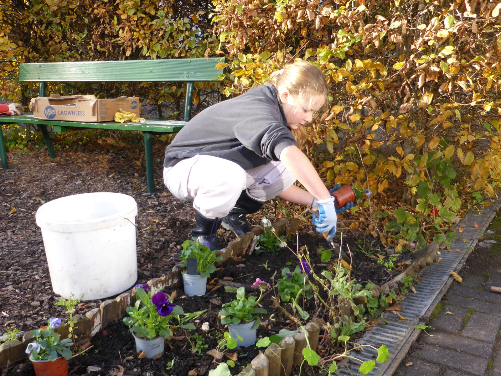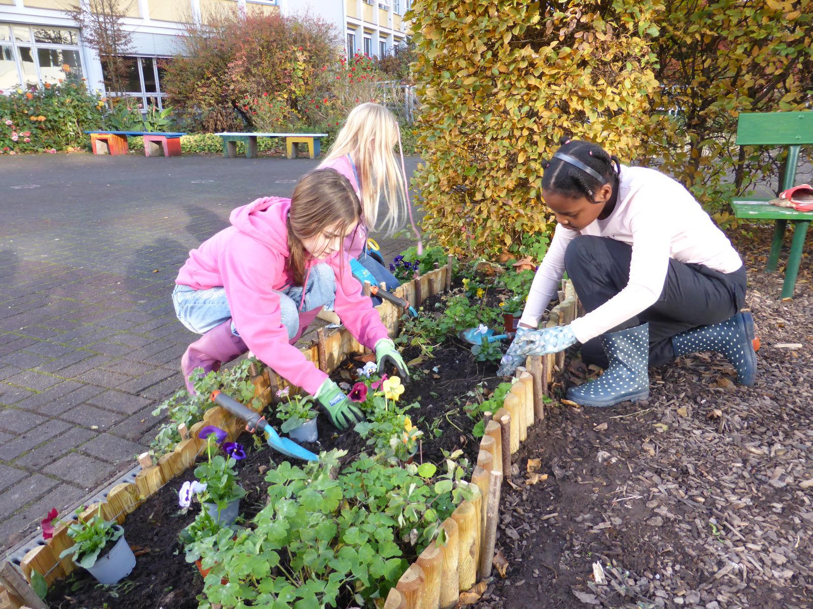 Der Herbst geht nun seinem Ende entgegen. Auf der „grünen Schulhof- Insel“ musste die Kapuzinerkresse einer Reihe Stiefmütterchen weichen, die bis zum Frühling für einen bunten Farbtupfer sorgen.