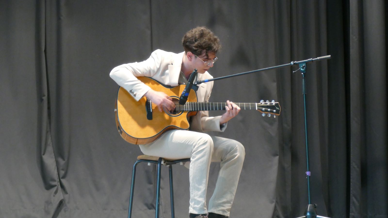 Weitere musikalische Beiträge folgten: Eine Schülerin überzeugte erneut mit ihrer Stimme, bevor der Musikkurs von Frau Jocks mit „Shape of You“ auf Ukulelen einen echten Ohrwurm präsentierte.