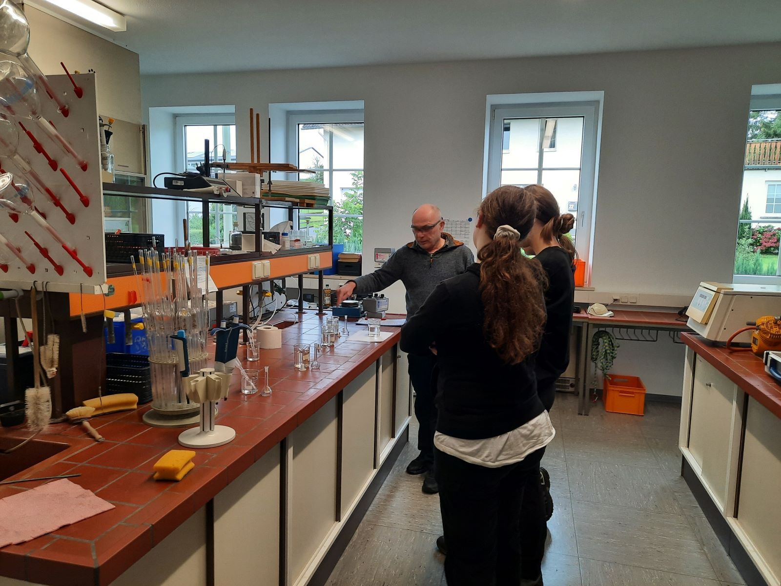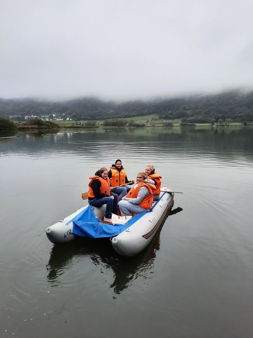 Am 30.9.2024 starteten 17 Schülerin des Biologie Leistungs- und Grundkurses zusammen mit Frau Weber und Herrn Ullenbruch in die Eifel zur Biologisch Ökologischen Station Bettenfeld der Universität Koblenz. Gut in Bettenfeld angekommen, wurden wir von der Stationsleiterin Frau Karger begrüßt, die uns dann ausführlich die Messgeräte erklärte, damit wir auf dem Maar verschiedene Untersuchungen durchführen und Wasserproben aus verschiedenen Tiefen nehmen konnten. Nun endlich ging es mit einem Schlauchboot und einem Blechkahn mit Schwimmwesten bekleidet raus auf das Wasser. Nach anfänglichen Koordinationsproblemen beim Rudern konnte doch zeitnah die Boje in der Maarmitte erreicht und das Boot festgemacht werden. Mit den professionellen und sehr teuren Messgeräten wurde in verschiedenen Wassertiefen der Sauerstoffgehalt, die elektrische Leitfähigkeit und der pH-Wert sowie die Fotosyntheseaktivität des Phytoplanktons bestimmt. Die Sichttiefe wurde ermittelt und Tiefenschlamm nach oben gebaggert und optisch, haptisch und olfaktorisch analysiert. Auf dem Rückweg wurde noch Plankton gefischt.