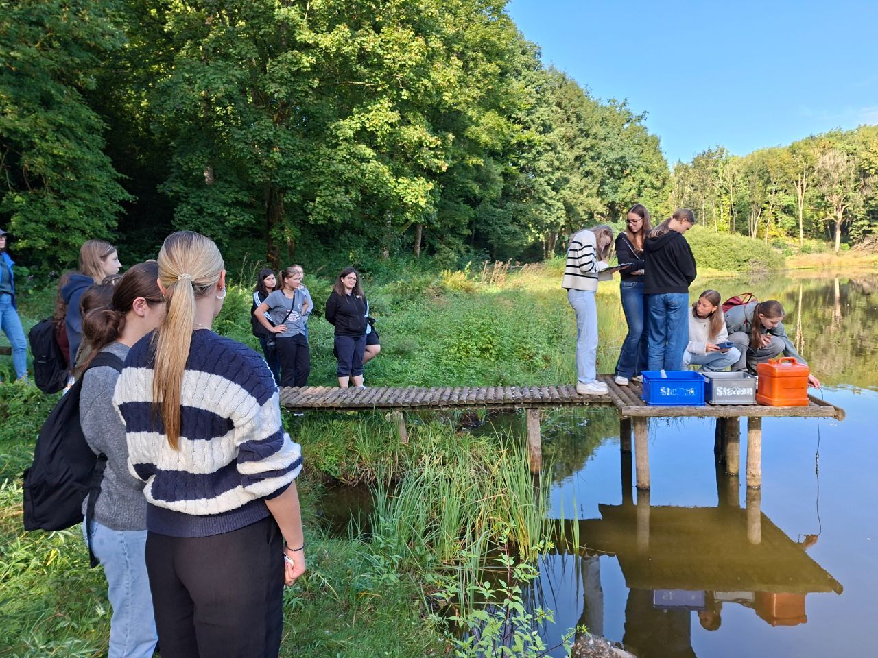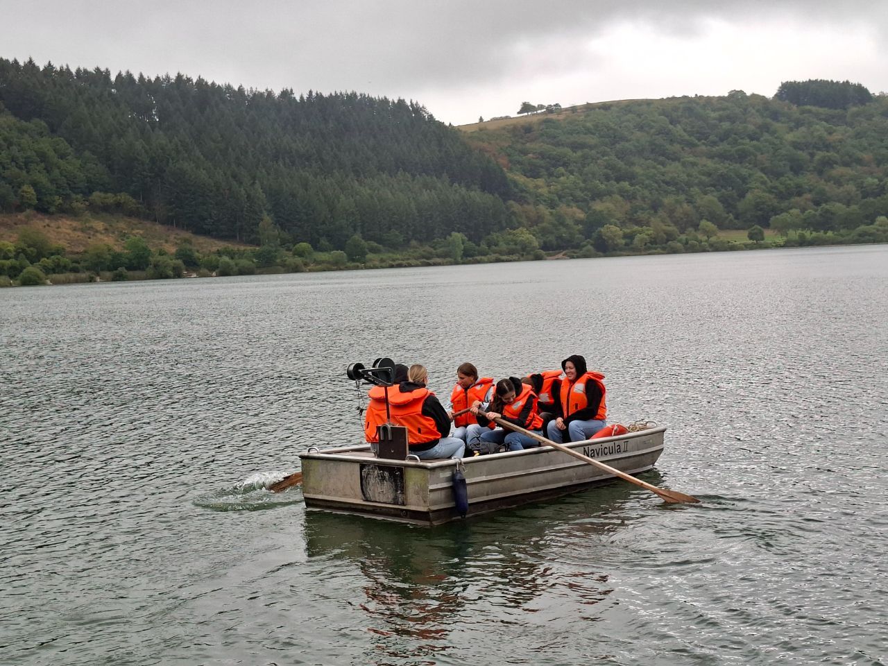 Am Donnerstag, 28.08.2025 starteten 20 Schülerinnen des Leistungskurses Biologie zusammen mit Frau Schunk und Herrn Ullenbruch nach Bettenfeld zur Biologisch-Ökologischen Station der Universität Koblenz, kurz B.Ö.S. Nach einer ausführlichen Einführung durch die Stationsleiterin Frau Karger ging es zum benachbarten Meerfelder Maar und mit zwei Booten ruderten die Schülerinnen mehr oder weniger geradlinig zu einer Boje. Hier wurden die Boote angebunden und die Untersuchung des Gewässers konnte starten.