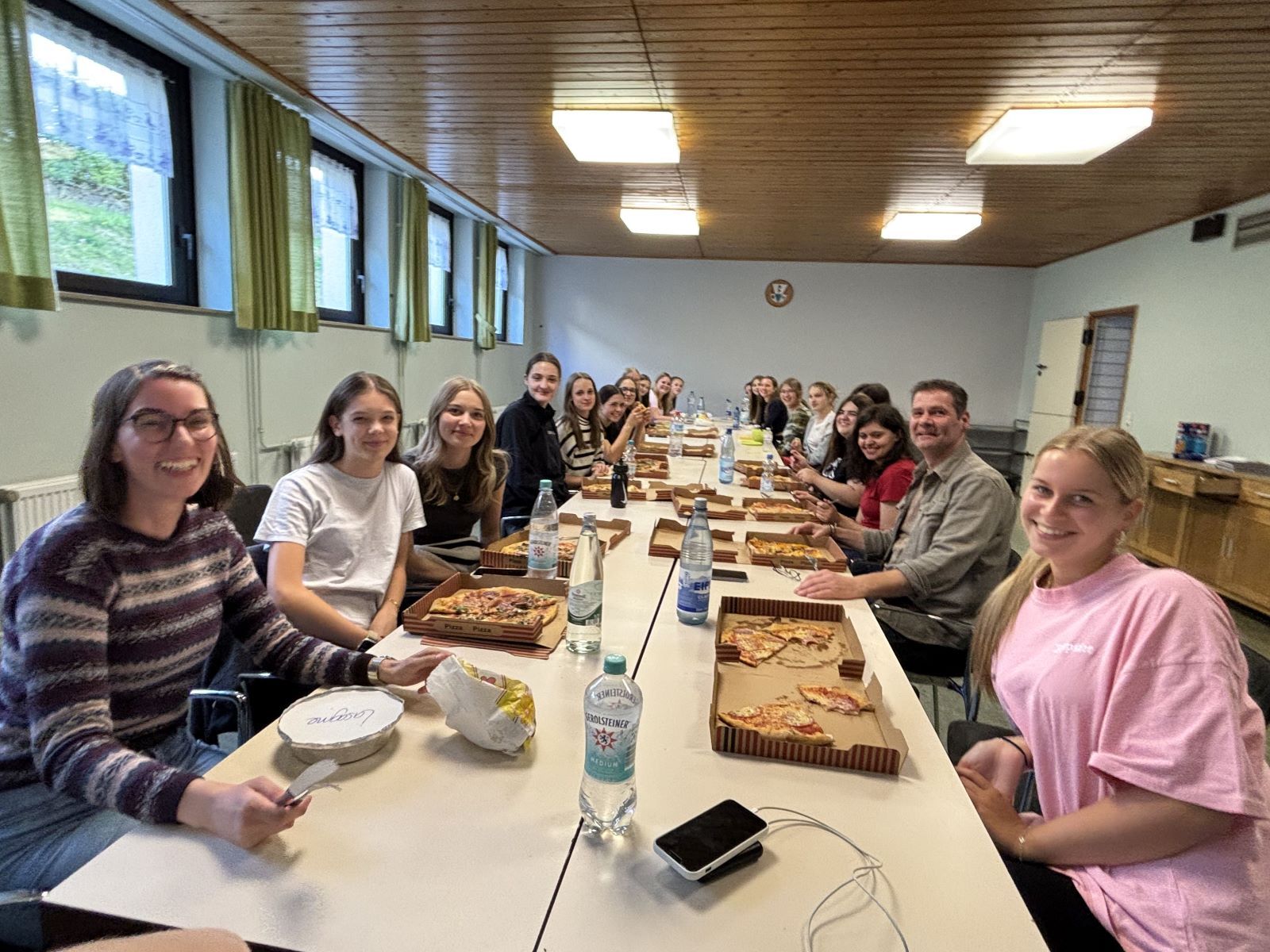 Gegen 17.30 Uhr ging es in das auf der anderen Straßenseite gelegene Gästehaus der Gemeinde Bettenfeld. Die Betten mussten noch bezogen werden und dann freuten sich alle auf die aus dem benachbarten Manderscheid angelieferte Pizza. Ein Großteil der Gruppe verblieb noch bis 22 Uhr gemeinsam im Speisesaal und mehrere Runden des Spiels Werwolf bereiteten allen viel Freude.