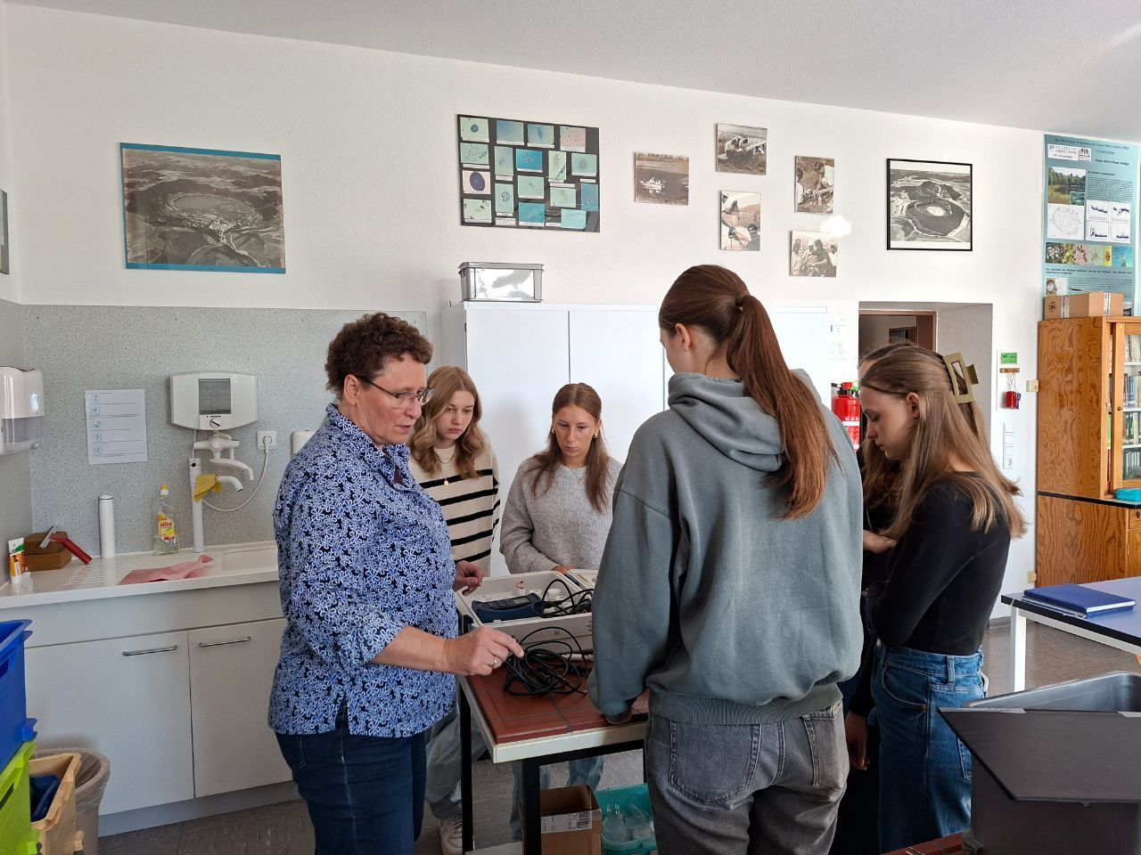 In verschiedenen Tiefen wurden mit professionellem Equipment der Sauerstoffgehalt, die Leitfähigkeit und die noch vorhandene Lichtmenge gemessen. Aus fünf verschiedenen Gewässertiefen haben die Schülerinnen Wasserproben für die Laboruntersuchungen gesammelt und eine Schlammprobe vom Maargrund gezogen. Auf dem Rückweg zum Ufer fischten die Schülerinnen noch Plankton. Bei einem Rundgang um das Maar erläuterte Herr Ullenbruch den Eifelvulkanismus und die Entstehung des Maares. Wie man durch den unangenehmen Geruch der Schlammprobe schon erahnen konnte, handelt es sich bei dem Meerfelder Maar um ein eutrophes Gewässer, also ein Gewässer, welches durch menschengemachte Stoffeinträge überdüngt wurde. Das führt gerade in den Sommermonaten zu Sauerstoffmangel und Faulgasbildung am Seegrund. Vom Ufer aus erfuhren die Schülerinnen etwas über die Ursachen der Eutrophierung und den Versuch der Menschen, das Maar durch Restaurierungs- und Sanierungsmaßnahmen wieder in einen besseren Zustand zu bringen.