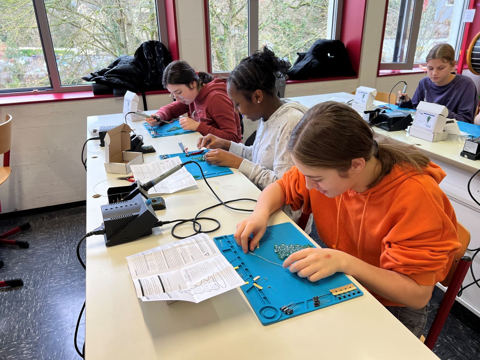 Für viele der Teilnehmerinnen war es das erste Mal, dass sie mit Lötkolben und elektronischen Bauteilen arbeiteten. Nach einer kurzen Einführung in die theoretischen Grundlagen zum Stromkreis und einer Sicherheitsunterweisung, ging es direkt an die Praxis. Mit großer Begeisterung und Konzentration löteten die Schülerinnen LEDs, Widerstände und Transistoren auf die vorbereiteten Platinen.