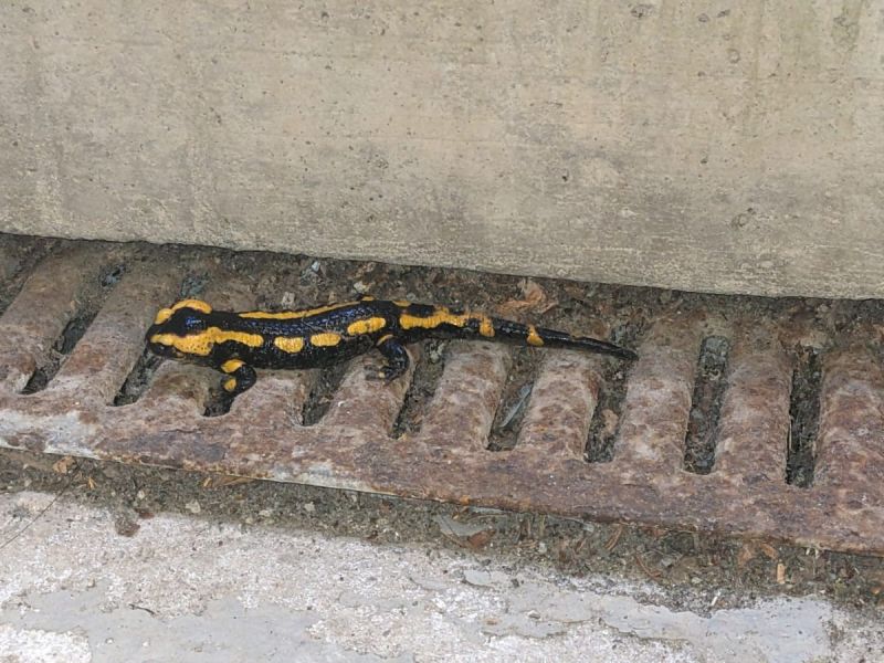 Am Dienstag, 12.11.24 morgens beim Aufschließen der Schule staunte unser Hausmeister nicht schlecht, als er auf dem Schulhof auf einen Feuersalamander traf. Die Tiere wandern in feuchten und kühlen Nächten auf der Suche nach Nahrung umher. Sinken die Temperaturen unter zwei Grad, ziehen sie sich in frostsichere Verstecke zurück. Das auffällige Farbmuster ist übrigens individuell und wir konnten schon zwei verschiedene Tiere in diesem Herbst auf dem Schulhof identifizieren. Bei der Färbung handelt es sich um eine Warntracht, da Feuersalamander Giftdrüsen in der Haut besitzen. Die menschliche Haut durchdringt das Gift nicht, in die Augen sollte es aber nicht gelangen. Wir freuen uns, dass sich die bedrohten Amphibien auf unserem weitläufigen und grünen Schulgelände wohlfühlen!