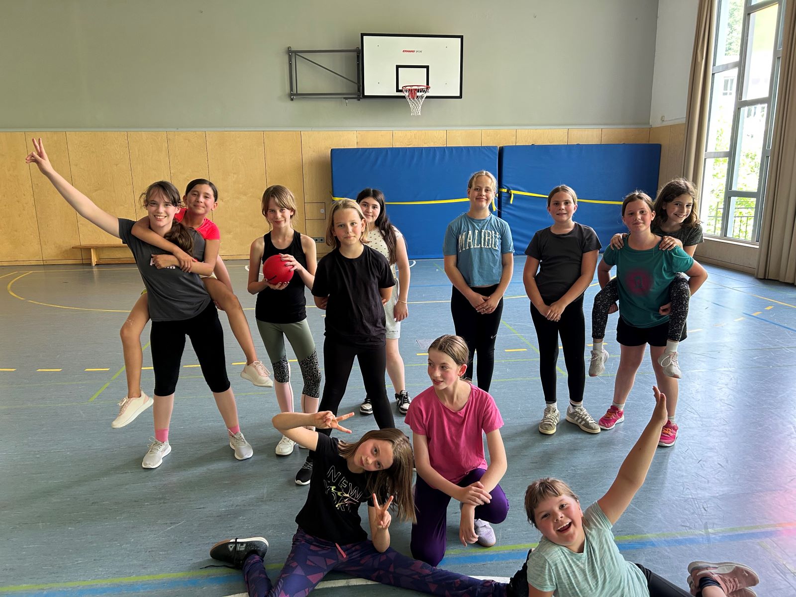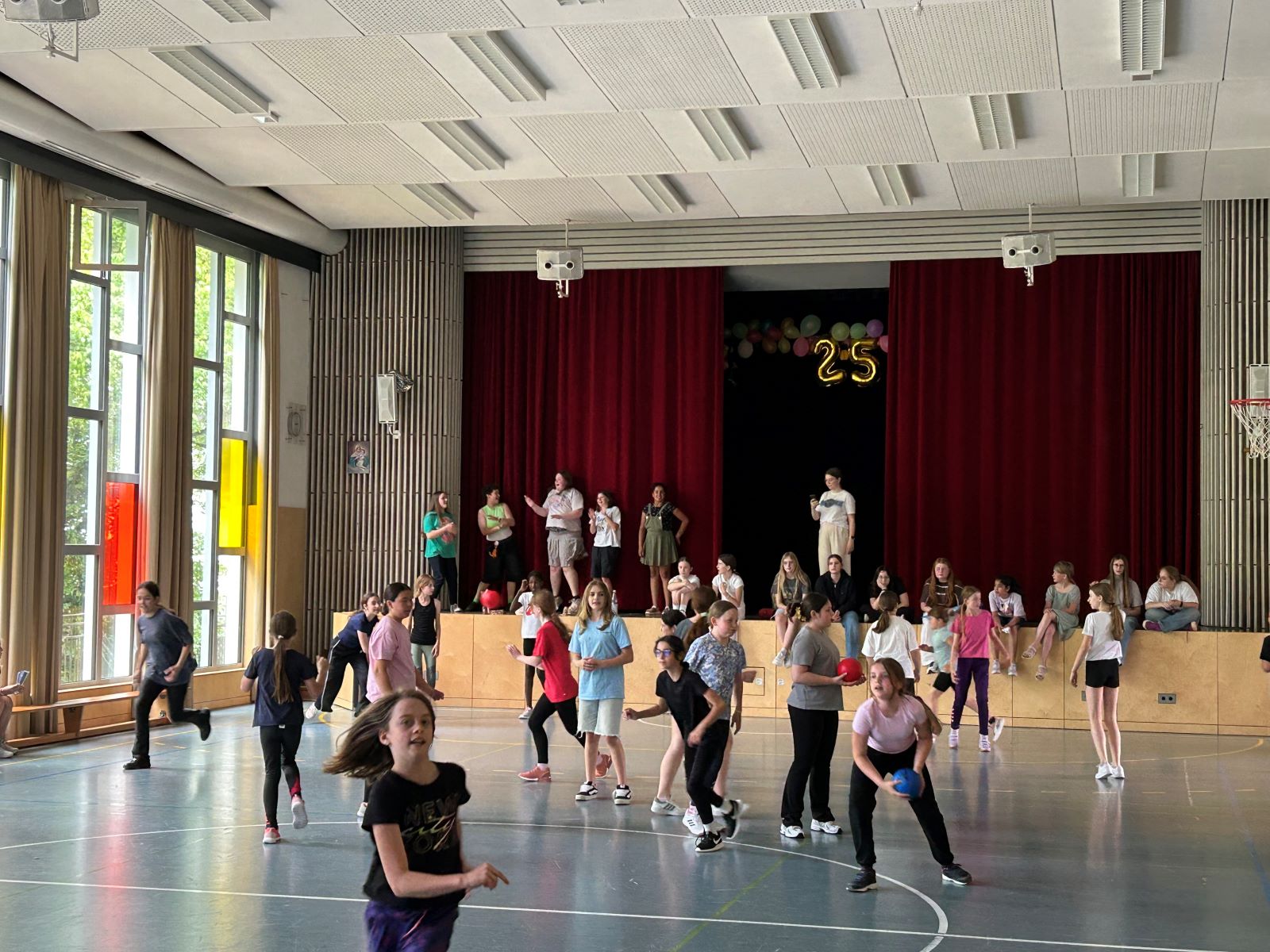 Unsere verschiedenen Lernzeiten traten täglich im Völkerball gegeneinander an und feuerten sich dabei lautstark gegenseitig an. Ein besonderes Highlight war das Freundschaftsspiel der Schülerinnen gegen die Lehrerinnen, das für ausgelassene Stimmung sorgte und sogar Zuschauerinnen von außerhalb der Ganztagsschule anzog.