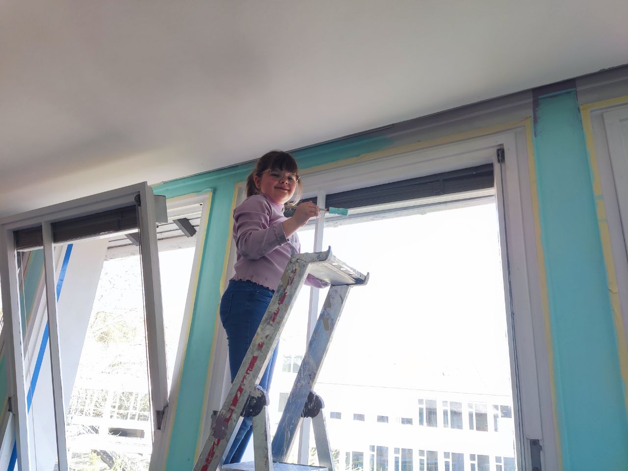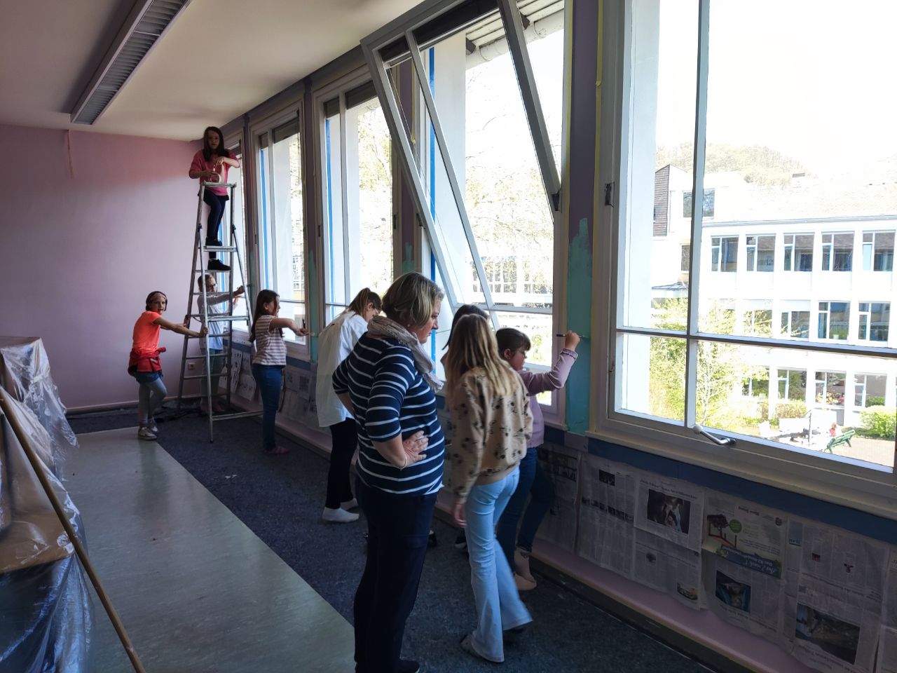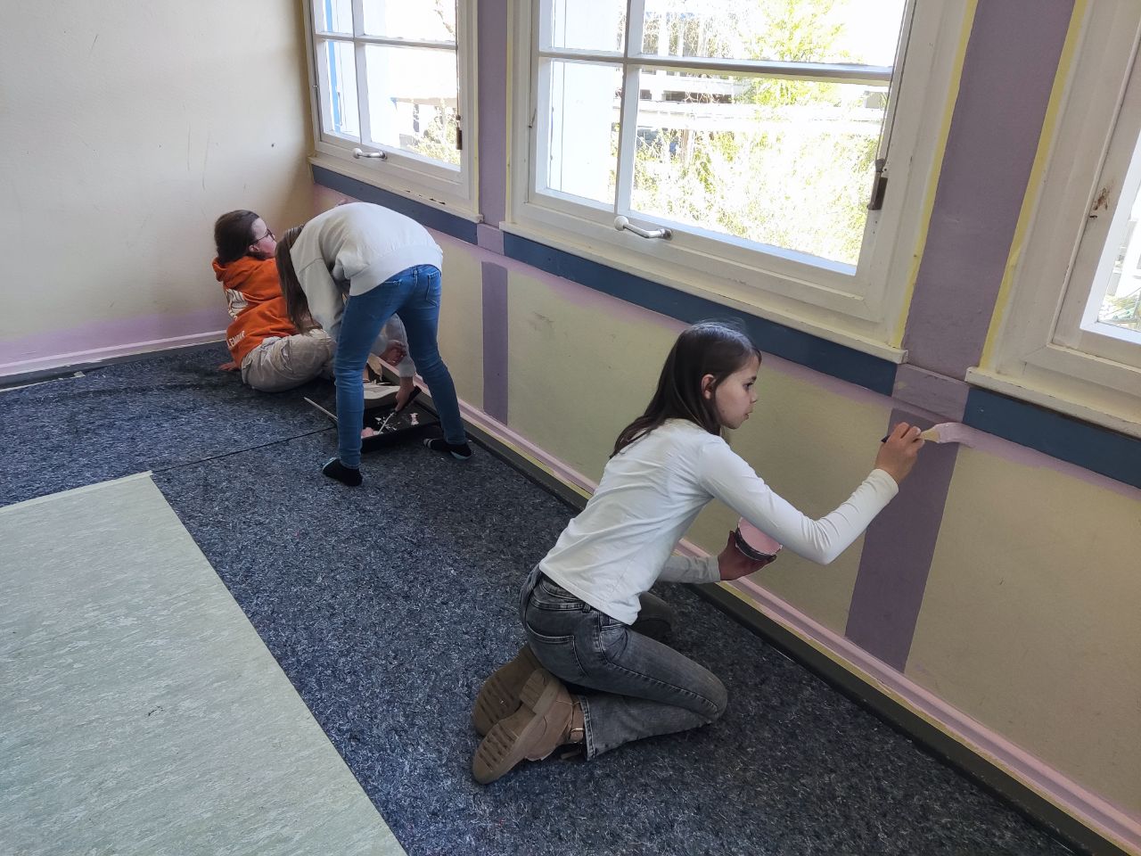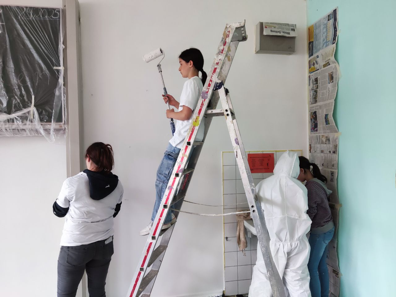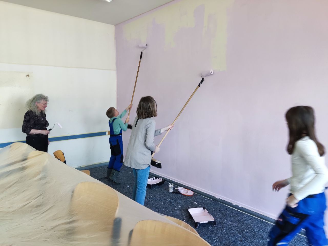 In der Woche vor den Osterferien konnten wir dann endlich zur Tat schreiten und die neuen Farben an die Wände bringen. Die Schule stellte uns sämtliche Materialien zur Verfügung und dank der Hilfe unseres Hausmeisters und zahlreicher Eltern konnten wir den Klassenraum in drei Nachmittagen streichen. Die Mädchen waren voller Enthusiasmus dabei: es wurden die Spinde ausgeräumt, der Klassenraum für eine Woche gewechselt, alles abgeklebt, der Boden ausgelegt, die Tische abgedeckt, mit Rollen und Pinseln gestrichen, auf dem Boden in den Ecken gehockt, auf Leitern gestiegen, Klebeband abgezogen und für die angrenzende Farbe wieder neu geklebt, um anschließend alles abzuziehen, Farbrest zu entfernen, Zeitungen und Klebeband zu entsorgen, Rollen und Pinsel auszuwaschen, Leisten abzuwischen, die Spinde wieder einzuräumen und Tische und Stühle zu stellen.