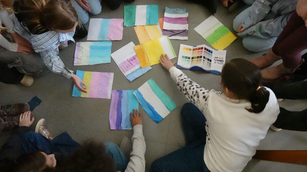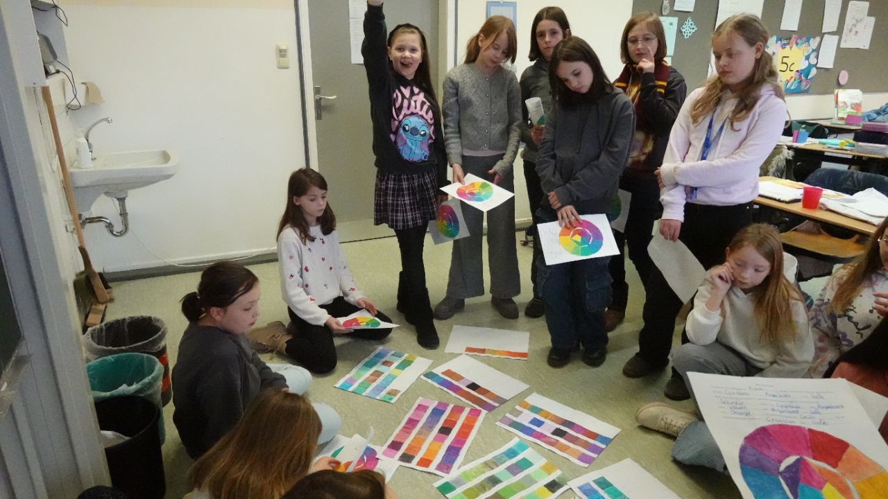 Die Farbgestaltung wurde im Fach Kunst besprochen. Dort stand die Farblehre in Theorie und Praxis im Lehrplan. Dabei ging es z.B. um fachsprachliche Begriffe: Farbkontrast, Nachbarfarbe, Gegenstandsfarbe, Farbauftrag, Kontrastfarbe, Farbordnung, sowie um Kenntnisse von Wirkungsmöglichkeiten der Farben. Nach einer Abstimmung wurden die Farben berry, pacific und banana ausgesucht.