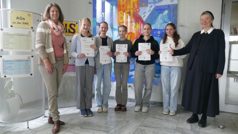 Jasmin B. (6c), Charlotte B. und Fanni S. (beide 7d), Boryana B. (8c), Mina D. (8d) und Sina N. (9c). Jasmin und Mina qualifizierten sich außerdem für die 3. Runde der Matheolympiade und nahmen an der Landesrunde teil.