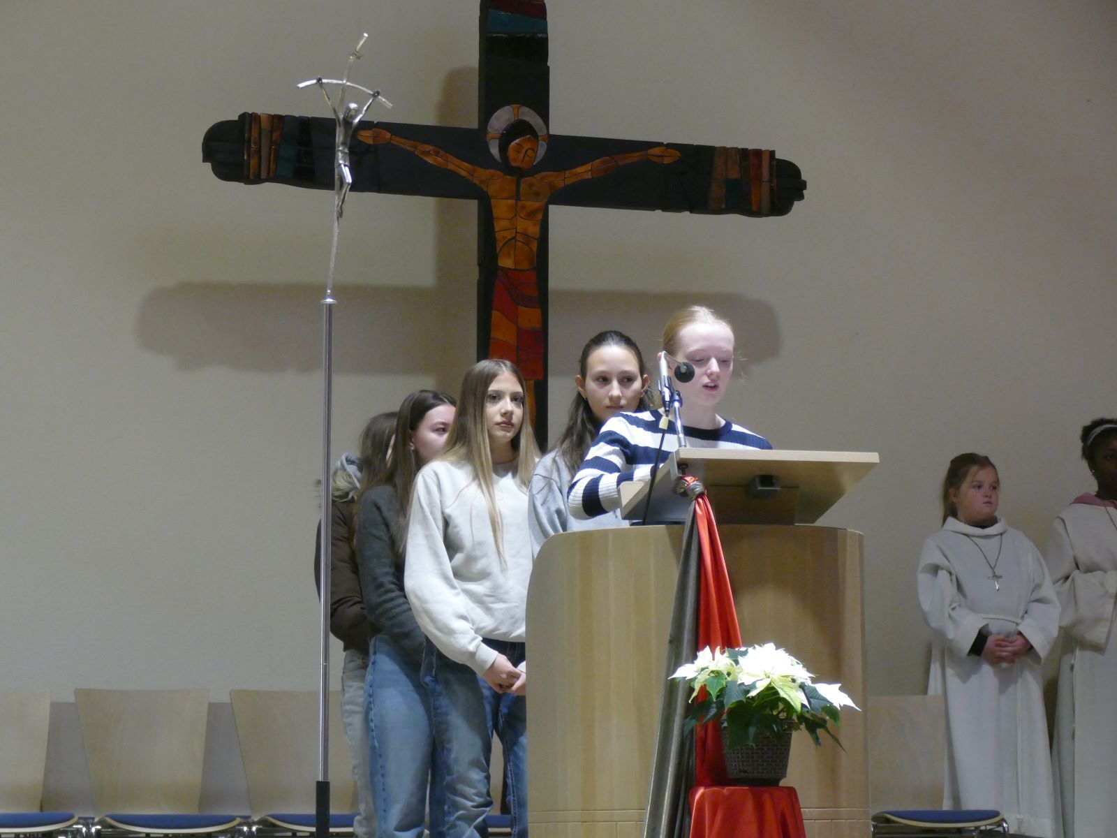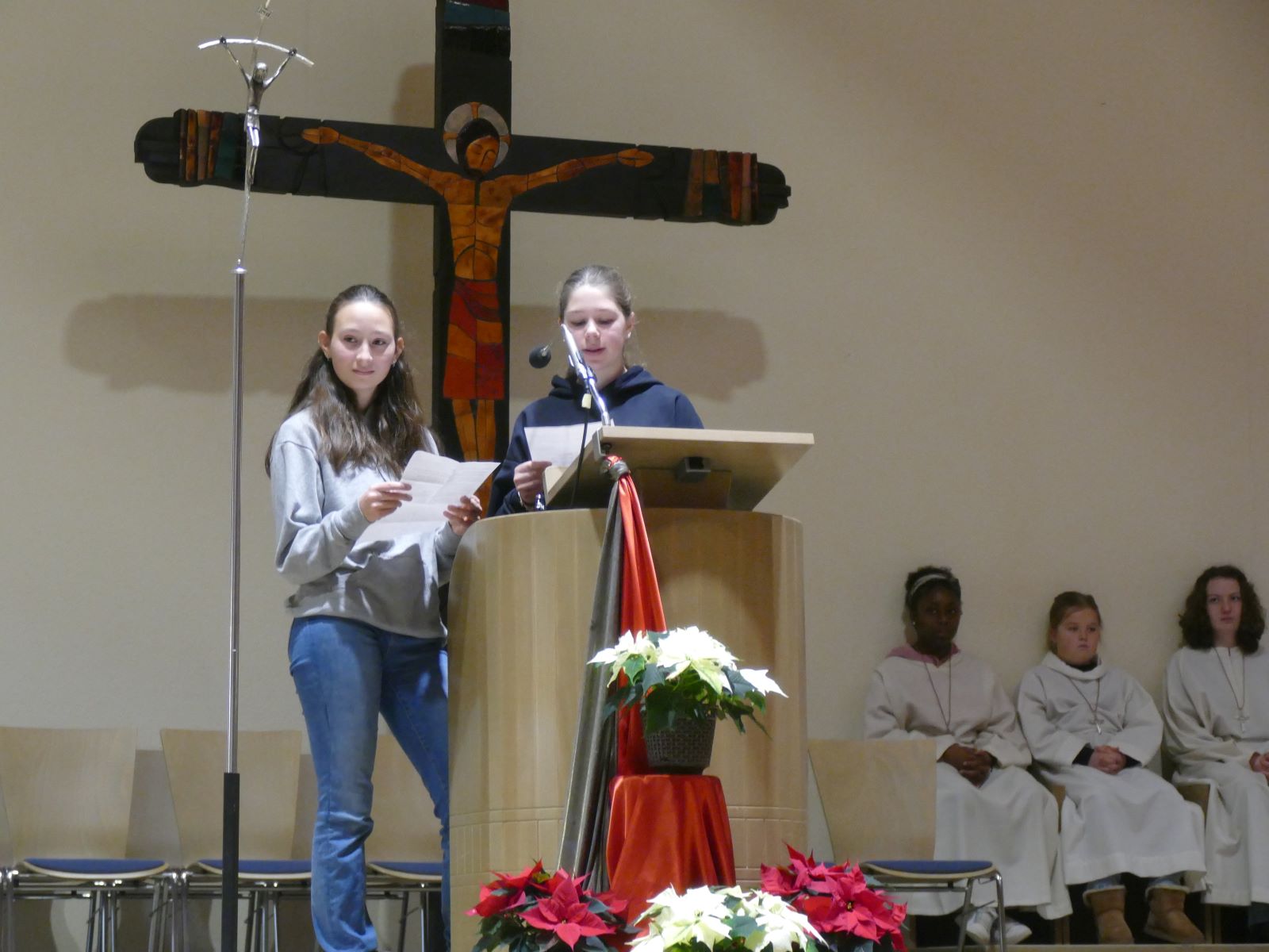 Als Hinführung zur alttestamentlichen Lesung erklärten zwei weitere Schülerinnen: „Der Prophet Jesaja spricht von Dunkelheit – und von Licht. Das Licht kommt nicht als Macht, sondern als Kind. Es bringt Frieden, der nicht laut ist, sondern leise.