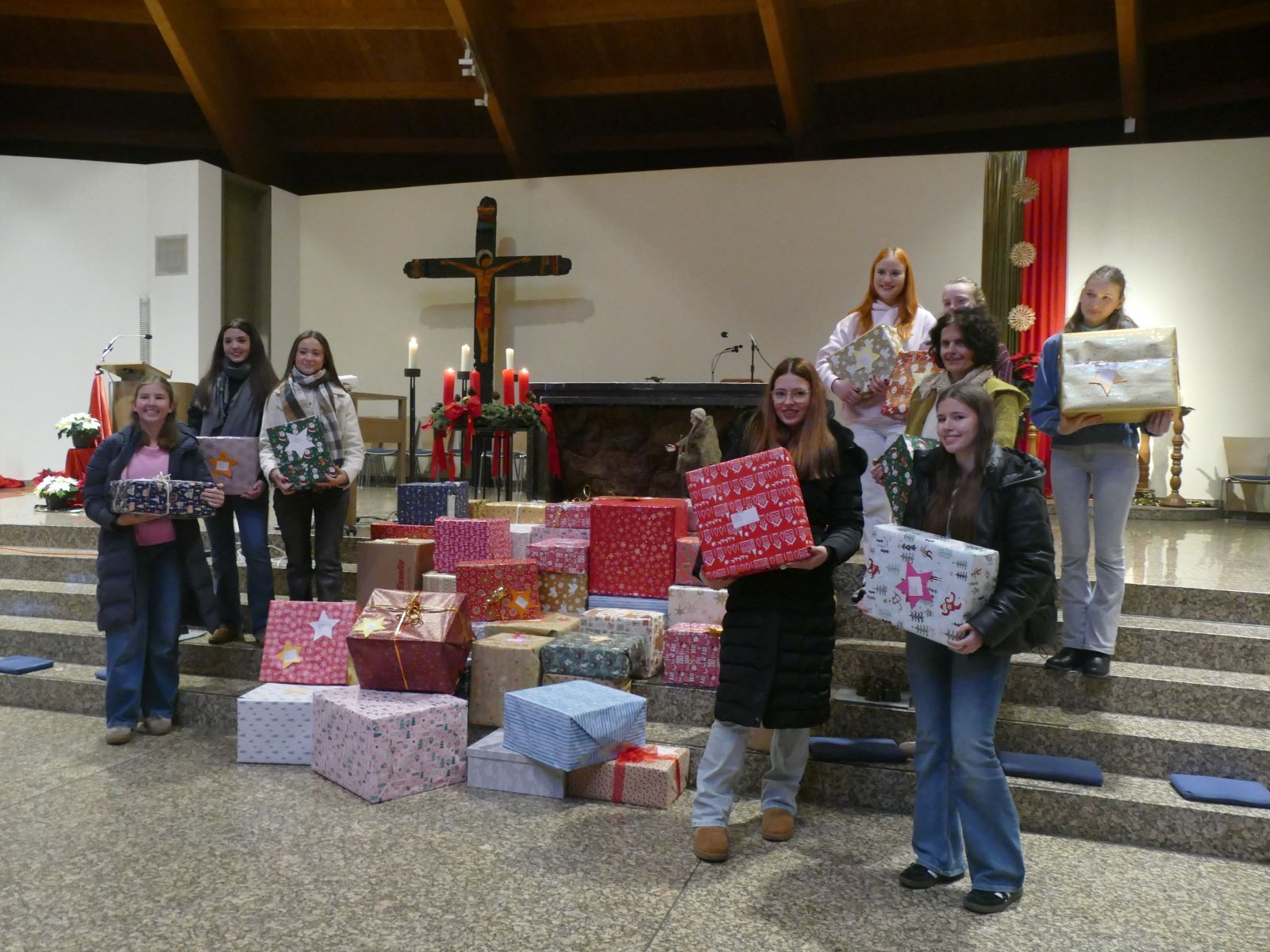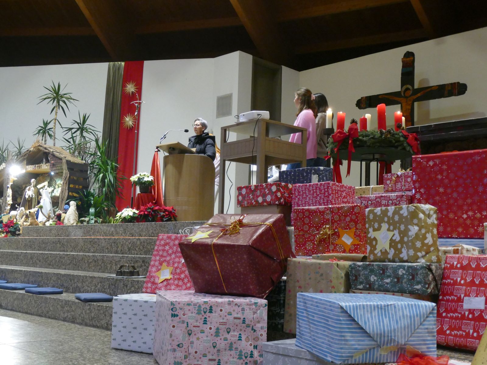 Während des Gottesdienstes zog ein großer Stapel mit Weihnachtspäckchen die Blicke auf sich. 60 liebevoll verpackte Kartons warteten auf sie Übergabe an den Adressaten. Diese wurde von den Schülersprecherinnen der Realschule plus und des Gymnasiums vorgenommen. Sie überreichten Frau Eichenberg die Weihnachtsgabe der Klassen und der Wohltäter aus der Schulgemeinschaft, die Lebensmittel, Hygieneartikel und Spielzeug für bedürftige junge Mütter und deren Kinder eingekauft und verpackt hatten. Frau Eichenberg erläuterte die Aufgaben des Vereins „Lichtzeichen e.V.“ und illustrierte anschaulich, wie durch die Geschenke der SMS ganz konkret Not gelindert und Friede verbreitet würde.