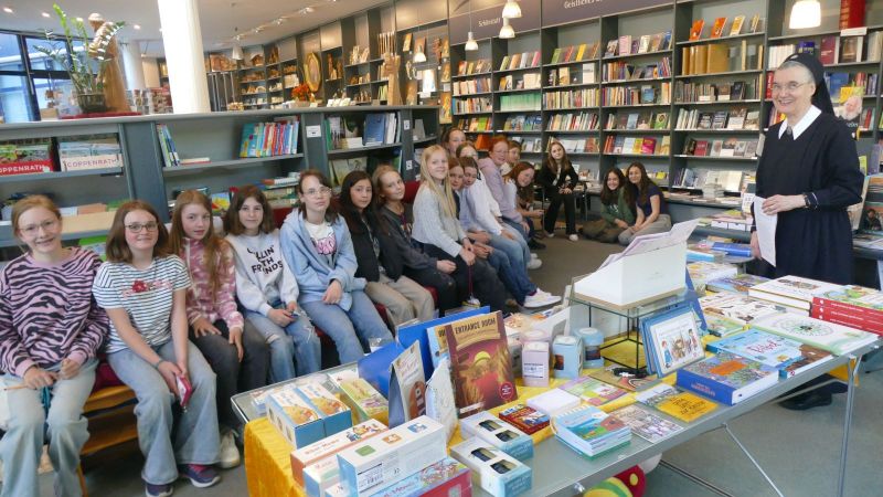 Alle 5. Klassen der Marienschule nehmen an der Aktion zur Leseförderung teil und erkunden den Schönstattverlag als nächstgelegene Buchhandlung. Zunächst orientieren sie sich in dem weitläufigen Geschäft, dann machen sie es sich auf den Sofas und Sitzkissen gemütlich und lauschen Sr. Annamarias Ausführungen zu Themen und Titeln, Autoren und Verlagen, ISBN-Nummer, Buchpreisbindung, Mehrwertsteuer und vielem mehr.