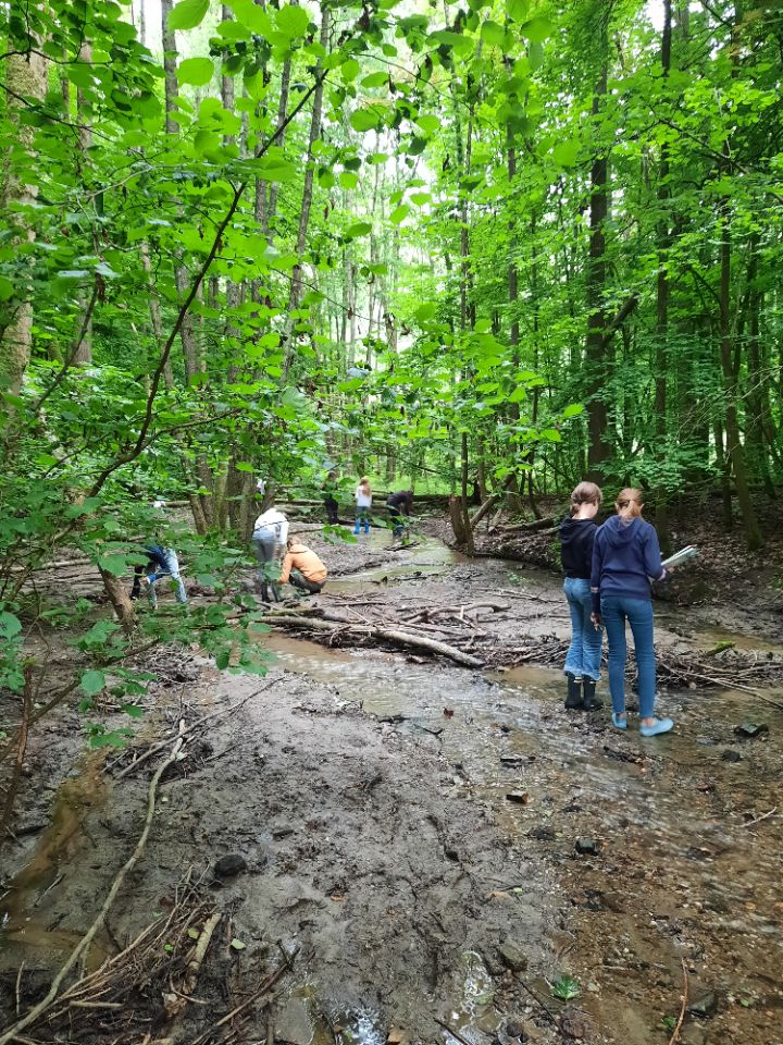 Ein Highlight zum Ende der Orientierungsstufe stellen die Gewässeruntersuchungen an einem der in unserem Tal fließenden Bäche dar. Anhand der Fließgeschwindigkeit, der Wassertemperatur und der Lebewesen im Bach bestimmen die Schülerinnen die Wasserqualität. Besonders groß ist die Freude, wenn ein Feuersalamander, eine Kröte oder mit den Lupen Kleinstlebewesen wie Köcherfliegenlarven, Bachflohkrebse oder Libellen samt ihrer Larven entdeckt werden. Auch die Bestimmung von Bäumen und Wildblumen macht Spaß.