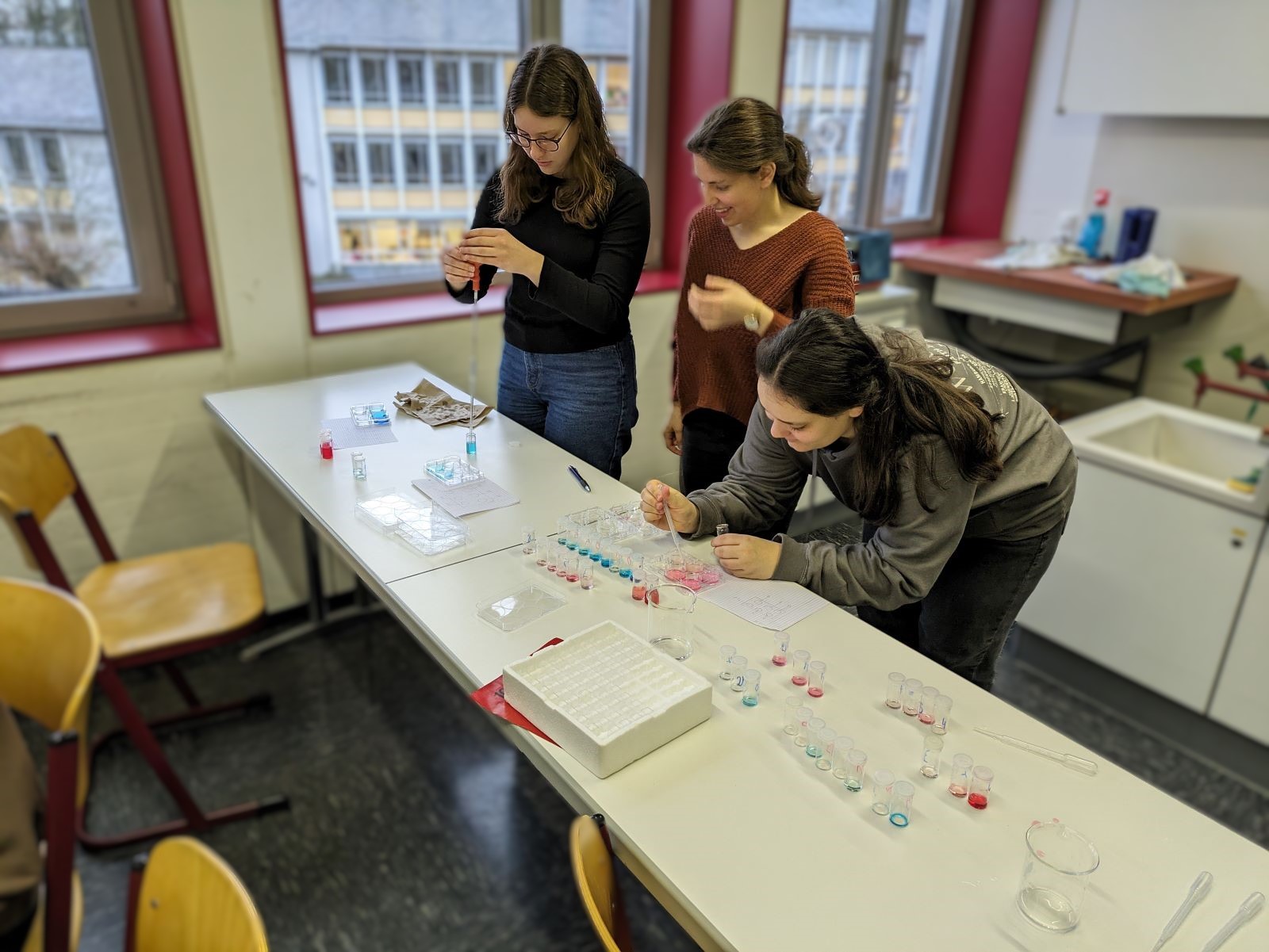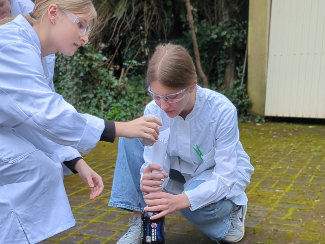 Ein Beispiel ist das interdisziplinäre Wasserprojekt. Hierbei untersuchen die Schülerinnen der 6. Klassen die Wasserqualität unseres Schulbachs im Vergleich zu anderen Gewässern. Die limnologische Exkursion nach Bettenfeld, an der auch Schülerinnen der Grund- und Leistungskurse Chemie teilnehmen, greift dieses Konzept auf und passt es an das Niveau der Sekundarstufe II an. Weitere Projekte und Exkursionen ermöglichen es, Fachinhalte „mit Leben zu füllen“ und Berufe im Kontext Chemie kennenzulernen. Am MINT-Tag haben unsere Schülerinnen die Gelegenheit, innerhalb und außerhalb der Schule weitere Facetten der Chemie kennenzulernen.