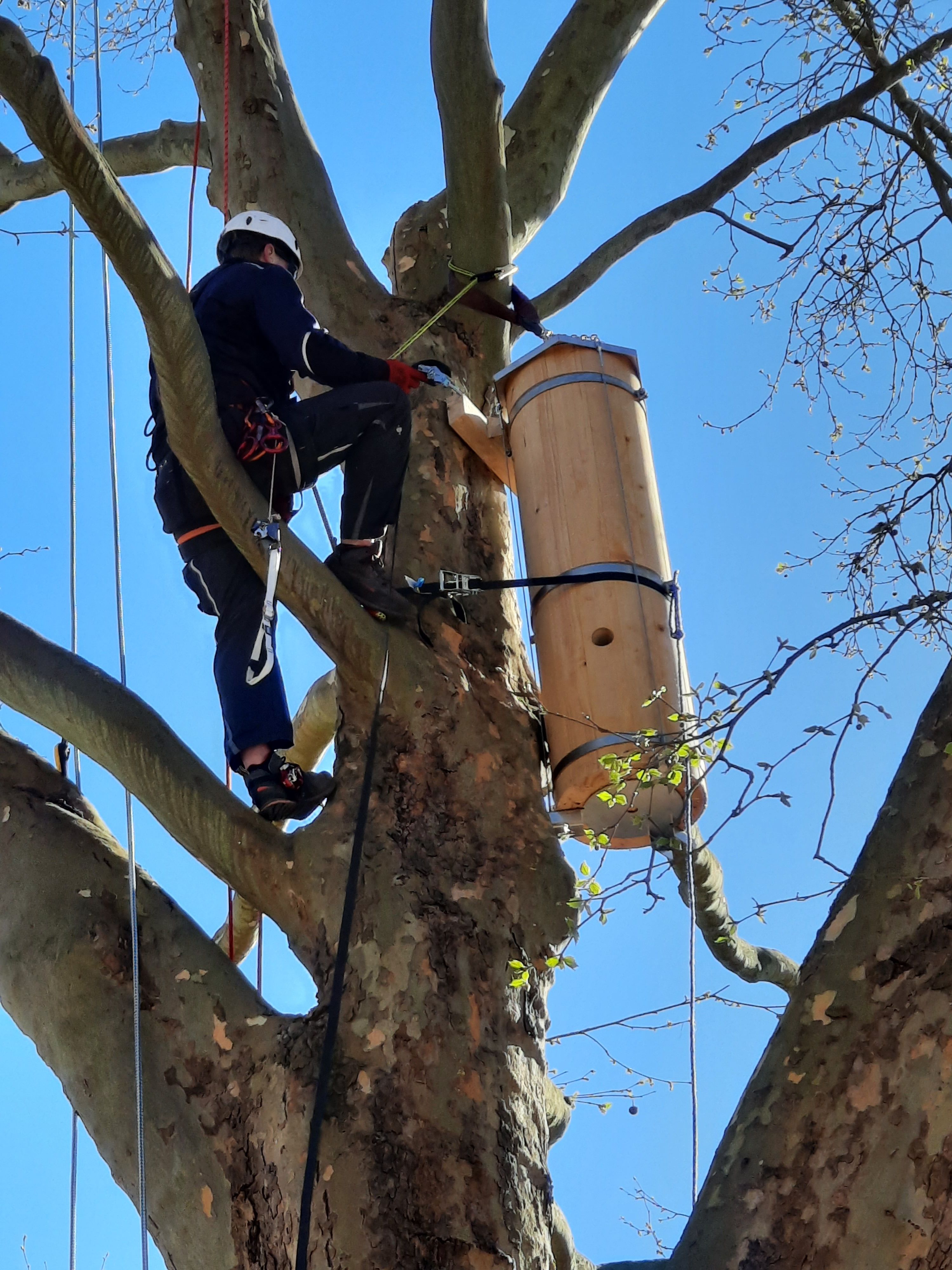 1. Lebensraum schaffen. Auf dem Schulhof sind im Laufe des Jahres 2022 Fledermauskästen als Sommerquartiere aufgehangen worden. Aufgrund der Renovierung von Altbauten und der Aufgabe von alten landwirtschaftlichen Gebäuden, gibt es nur noch wenige Unterschlupfmöglichkeiten für Fledermäuse. Ebenso haben wir durch einen Kontakt zum Kloster Arenberg, Koblenz die Möglichkeit erhalten einen Schiffer-Tree© auf dem Schulgelände aufzuhängen. In unseren forstwirtschaftlich genutzten Wäldern gibt es nur noch wenige alte abgestorbene Bäume, die vielen Tierarten wie Fledermäusen, Spechten, Hornissen oder Bienen Unterschlupf bieten. Der Schiffer-Tree© ist eine künstliche Baumhöhle, die hier Abhilfe schafft. Für Insekten haben wir selbstgebaute Insektenhotels aufgehangen.